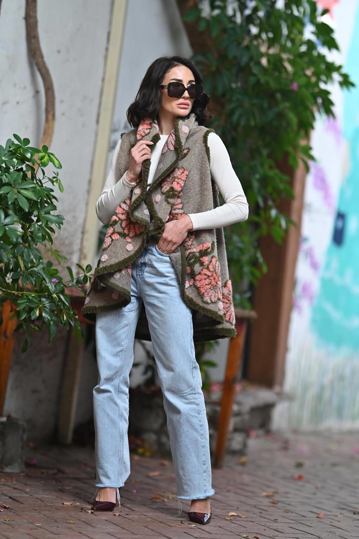 Vizon Rengi Çiçek Desenli Keçe Yelek