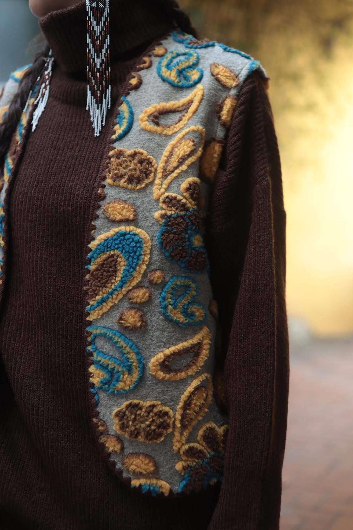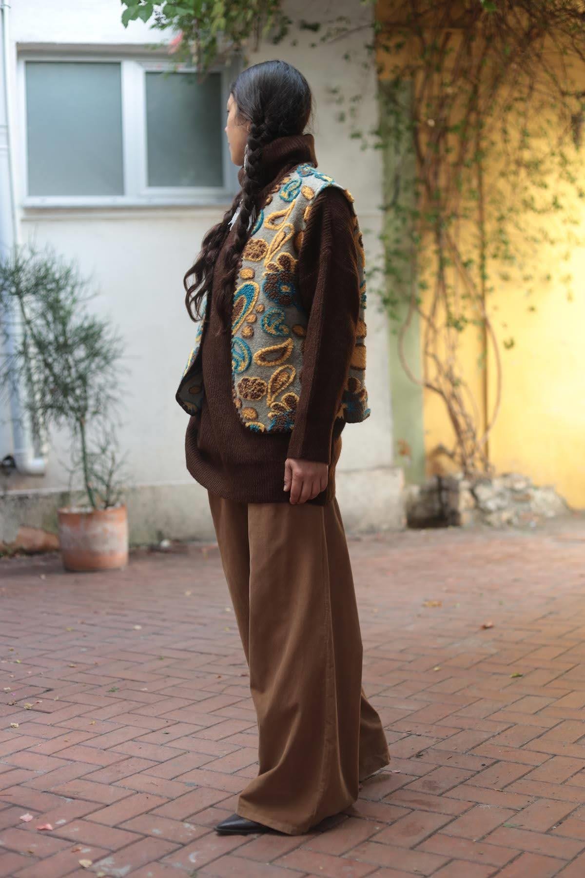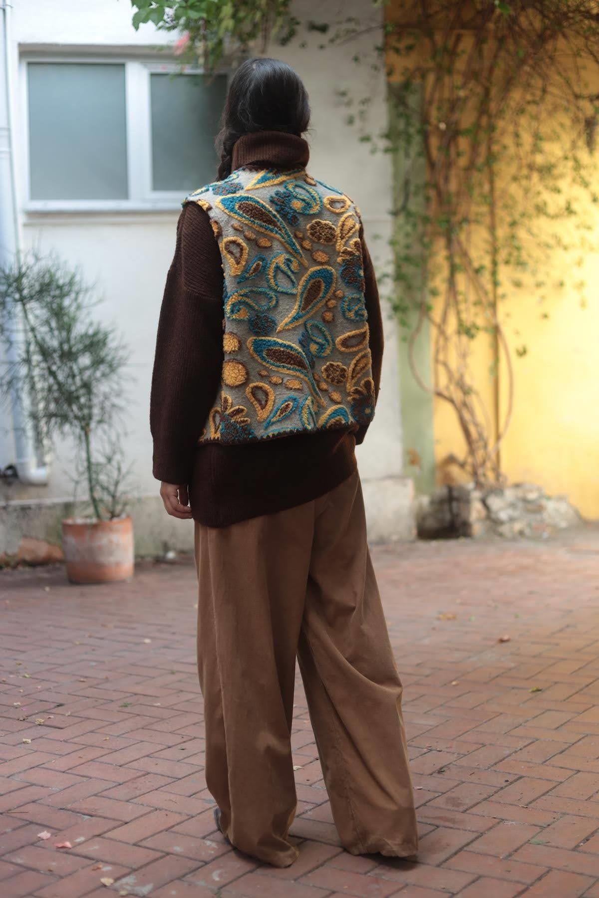 Vizon Rengi Çiçek Desenli Yünlü Keçe Yelek