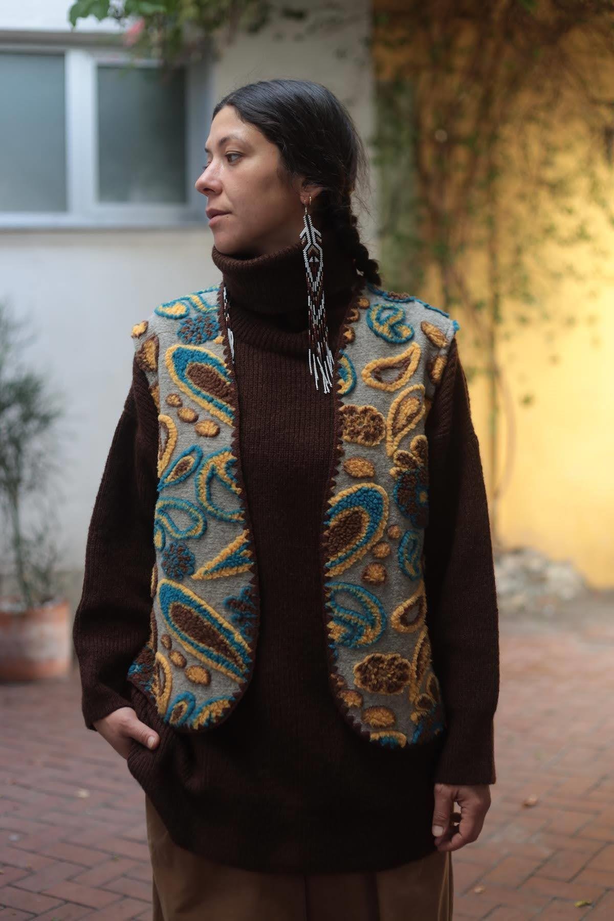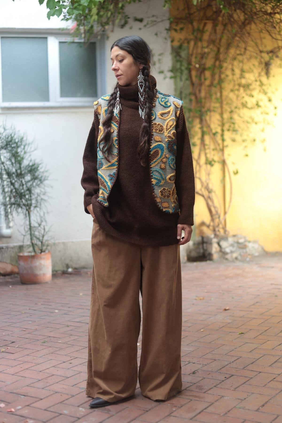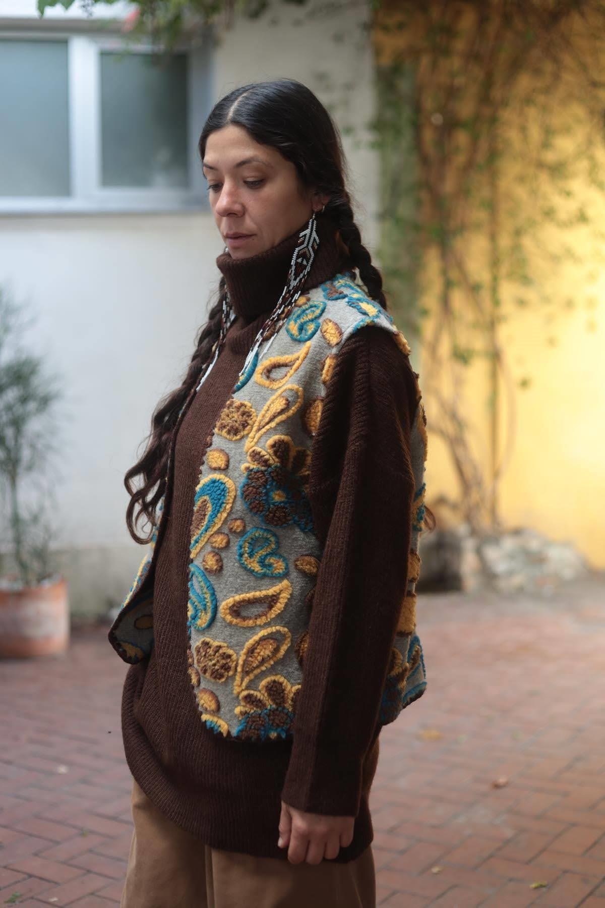 Vizon Rengi Çiçek Desenli Yünlü Keçe Yelek