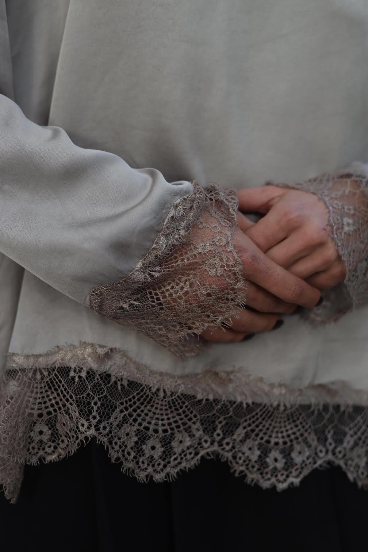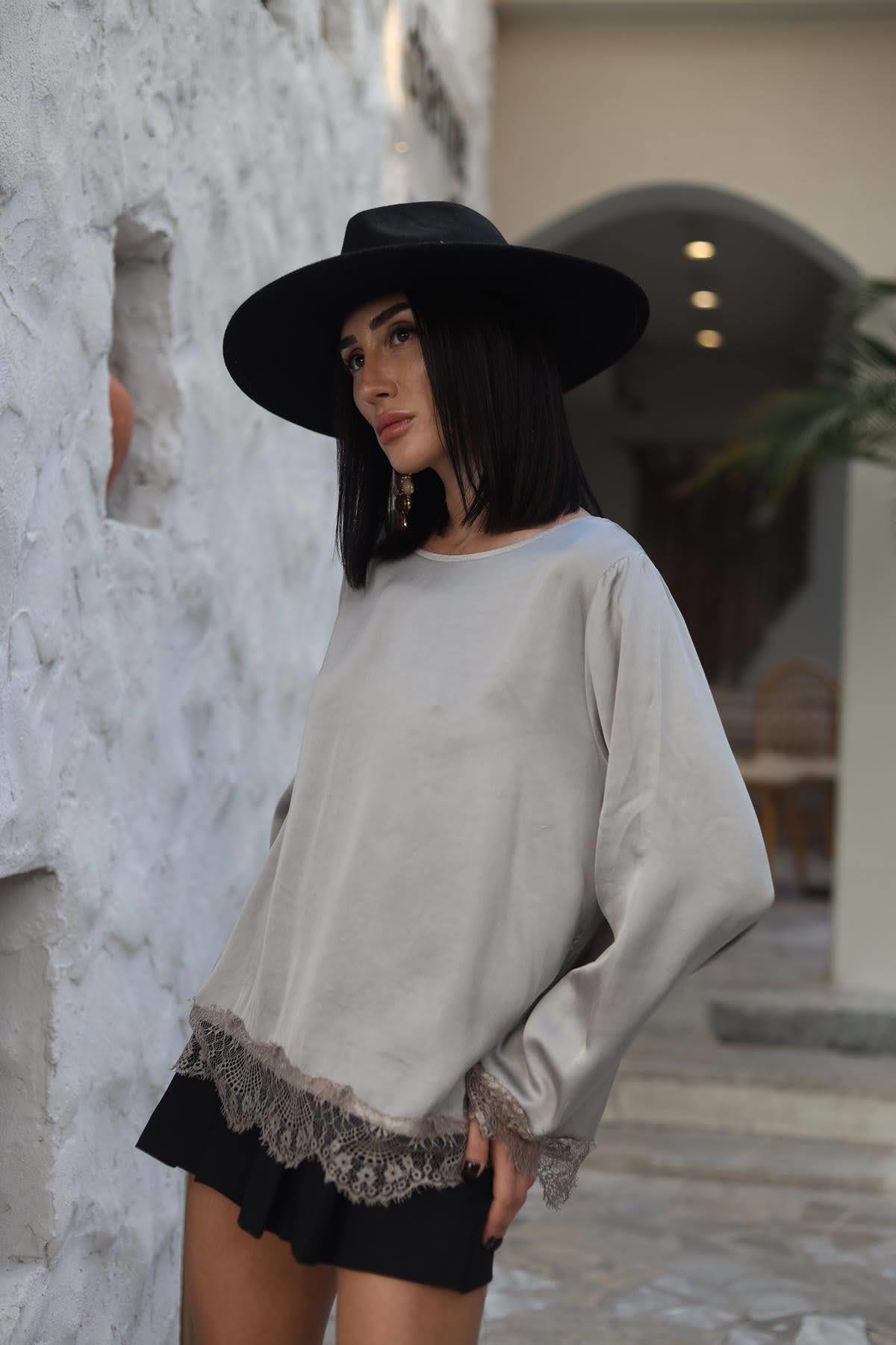 Vizon Rengi Dantelli Uzun Kollu Saten Bluz