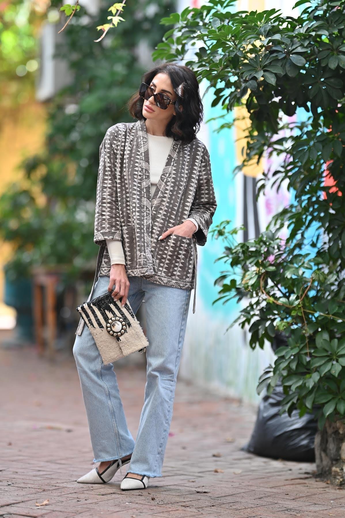 Vizon Rengi Desenli Çoban Dikişli Ceket