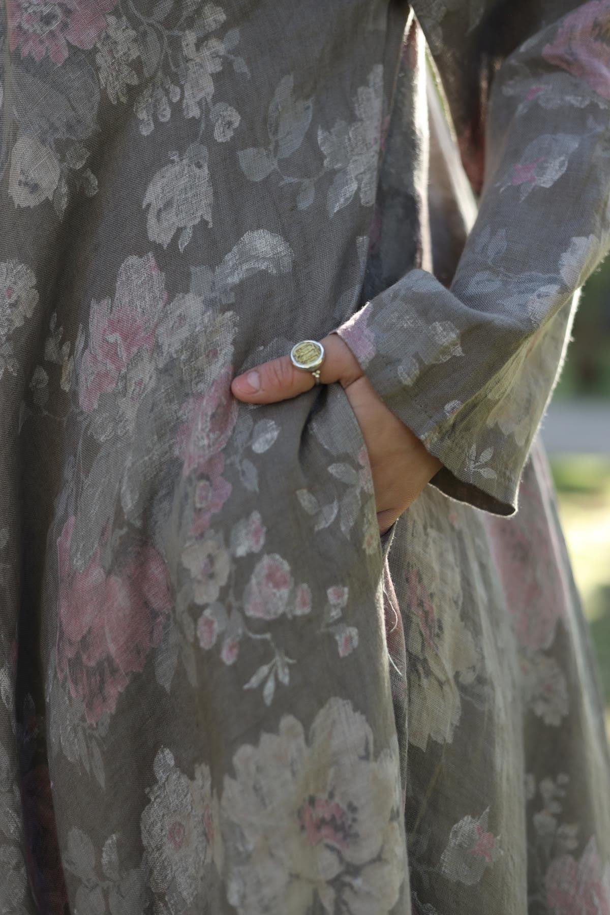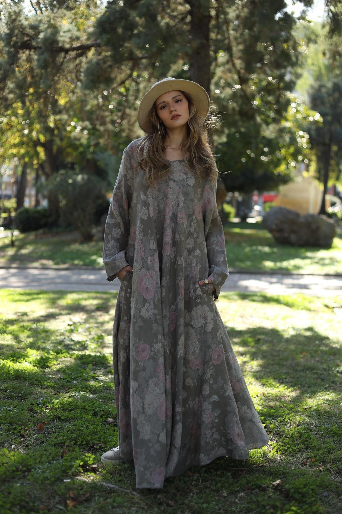 Vizon Rengi Desenli Önü Arkası V Keten Elbise