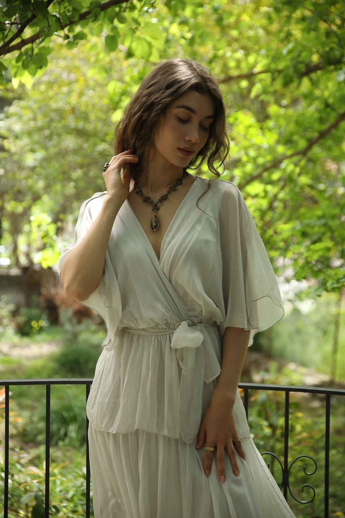 Vizon Rengi Kruvaze Yaka Belden Bağlamalı İpek Elbise
