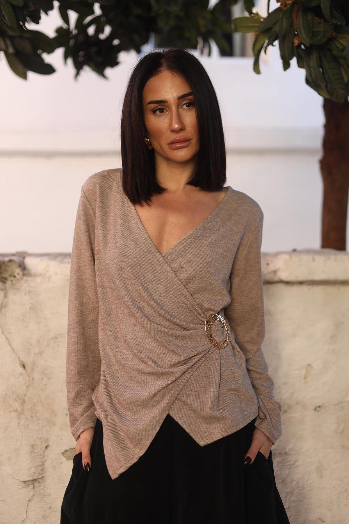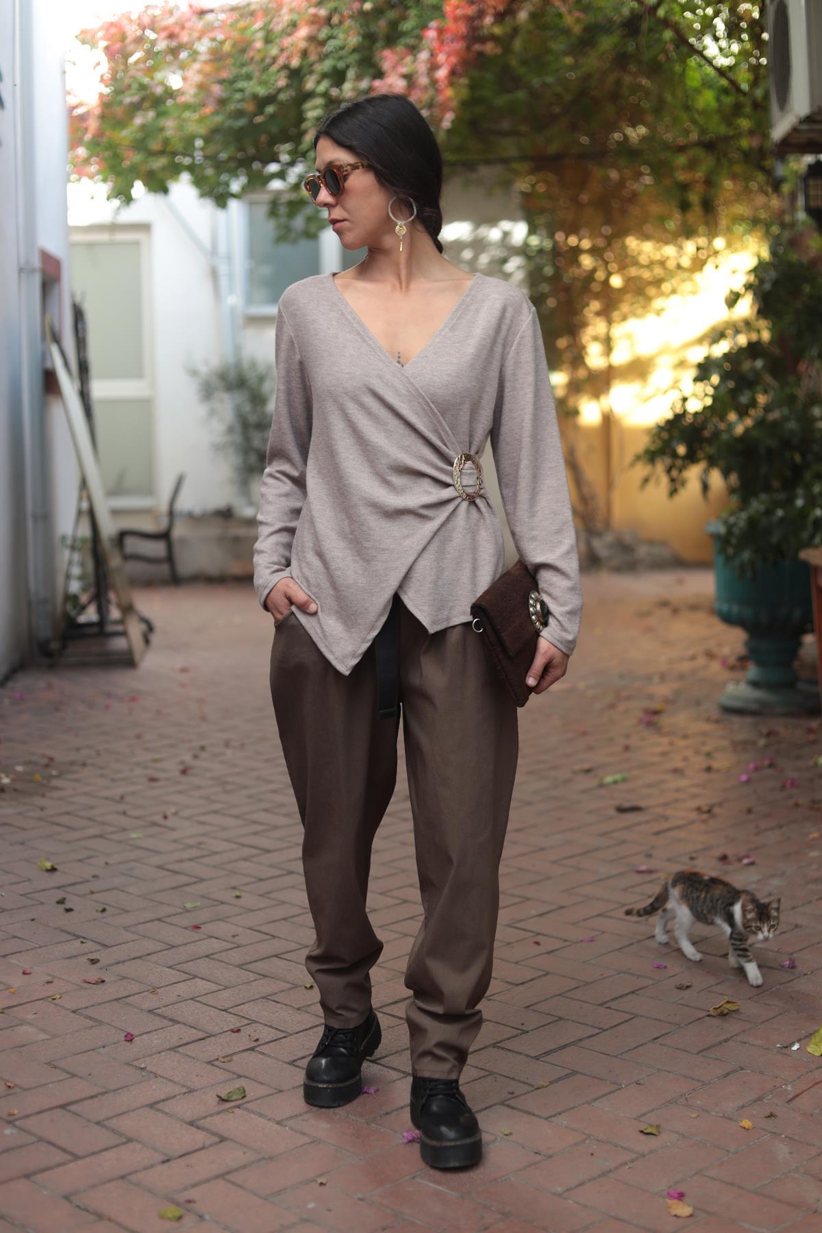 Vizon Rengi Kruvaze Yaka Tokalı Triko Bluz