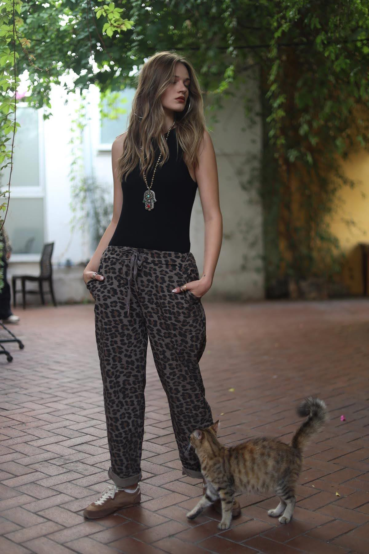Vizon Rengi Leopar Desenli Likralı Pantolon