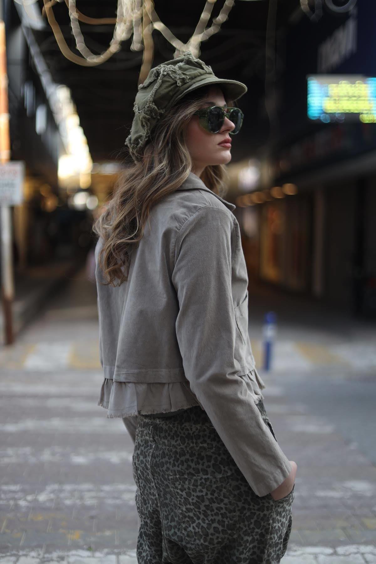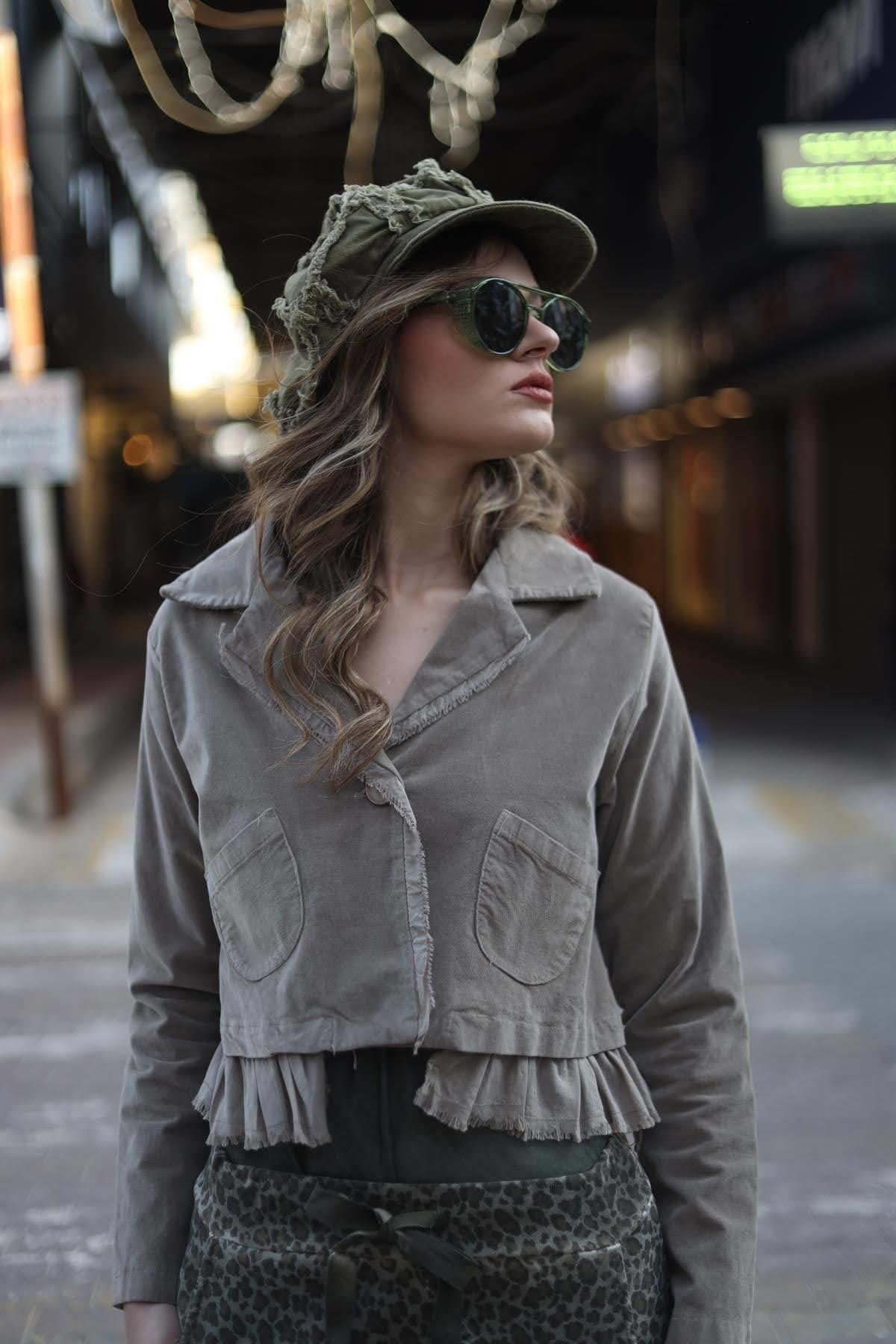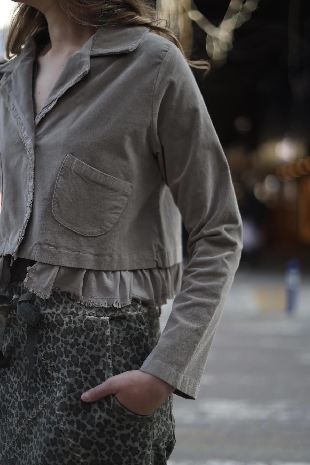 Vizon Rengi Parça Detaylı Kadife Crop Ceket