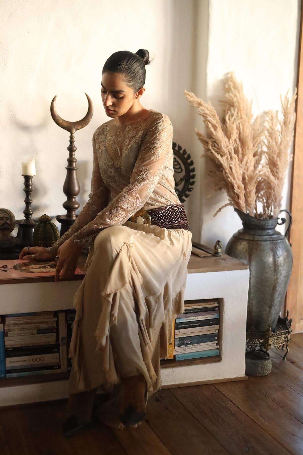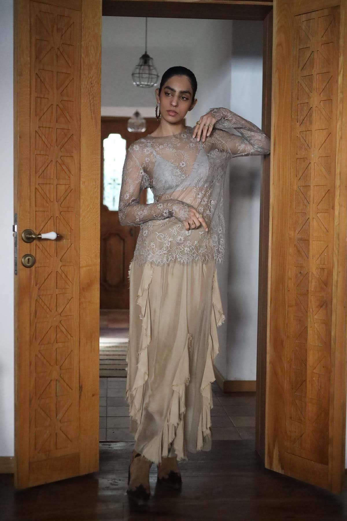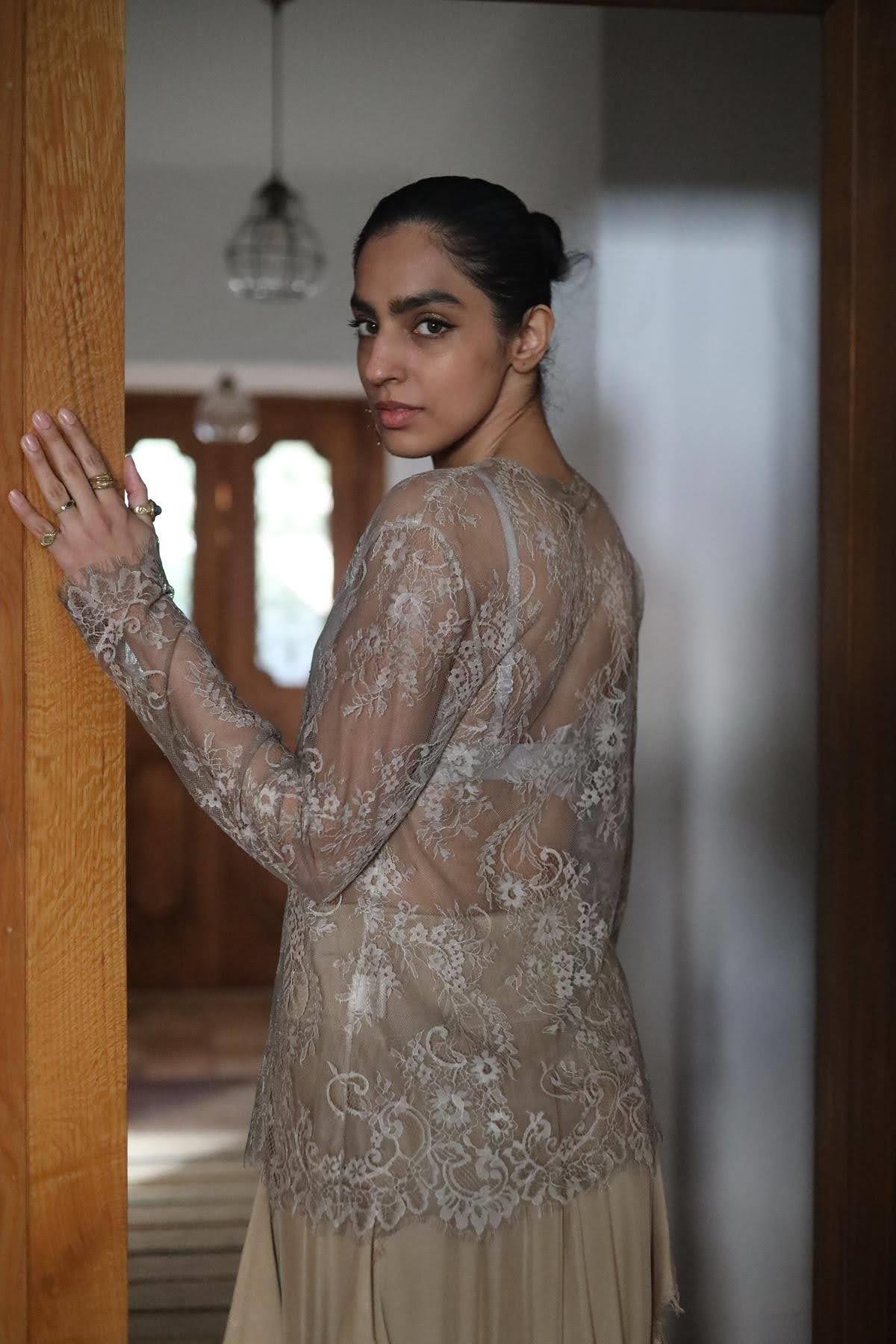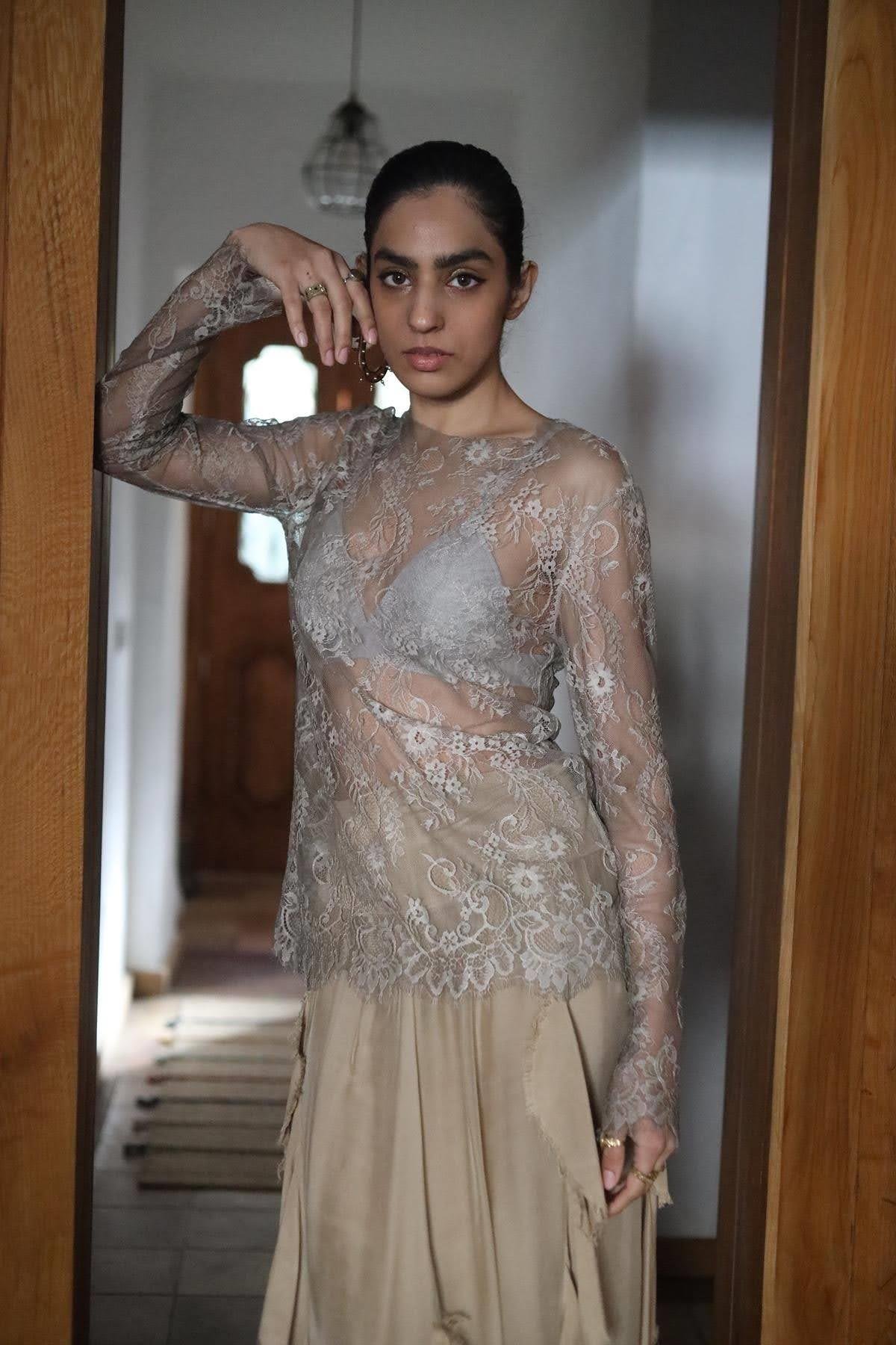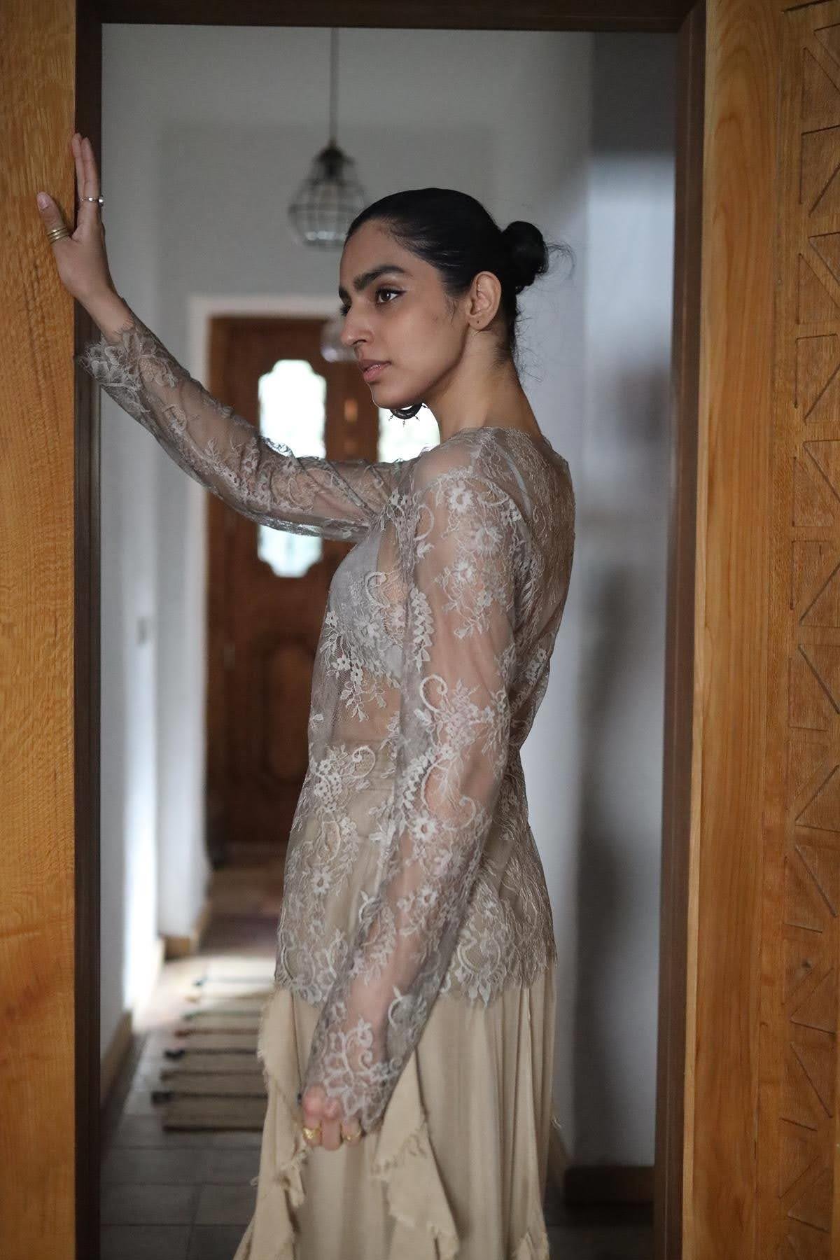 Vizon Rengi Uzun Kollu Dantel Bluz
