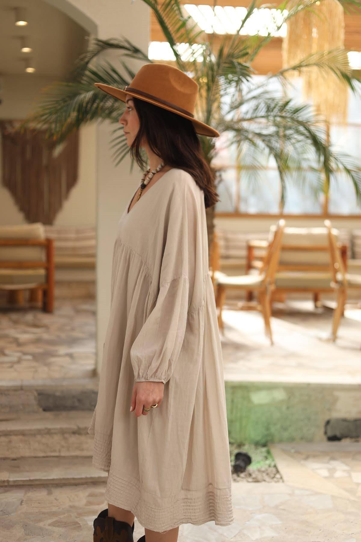 Vizon Rengi V Yaka Eteği Dikiş Detaylı Elbise