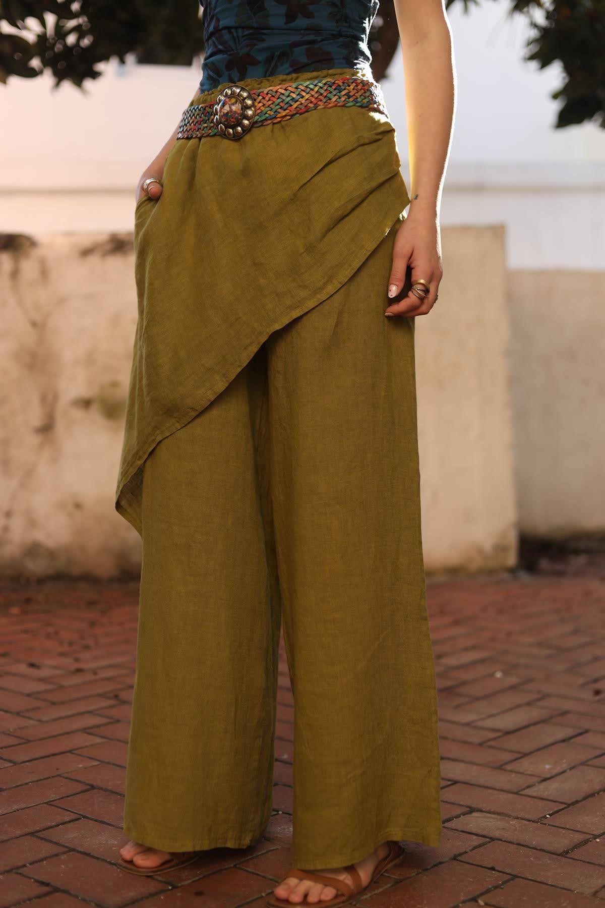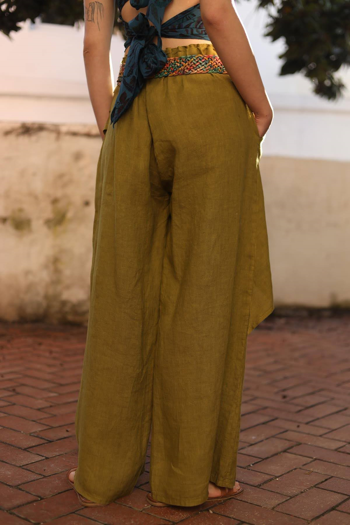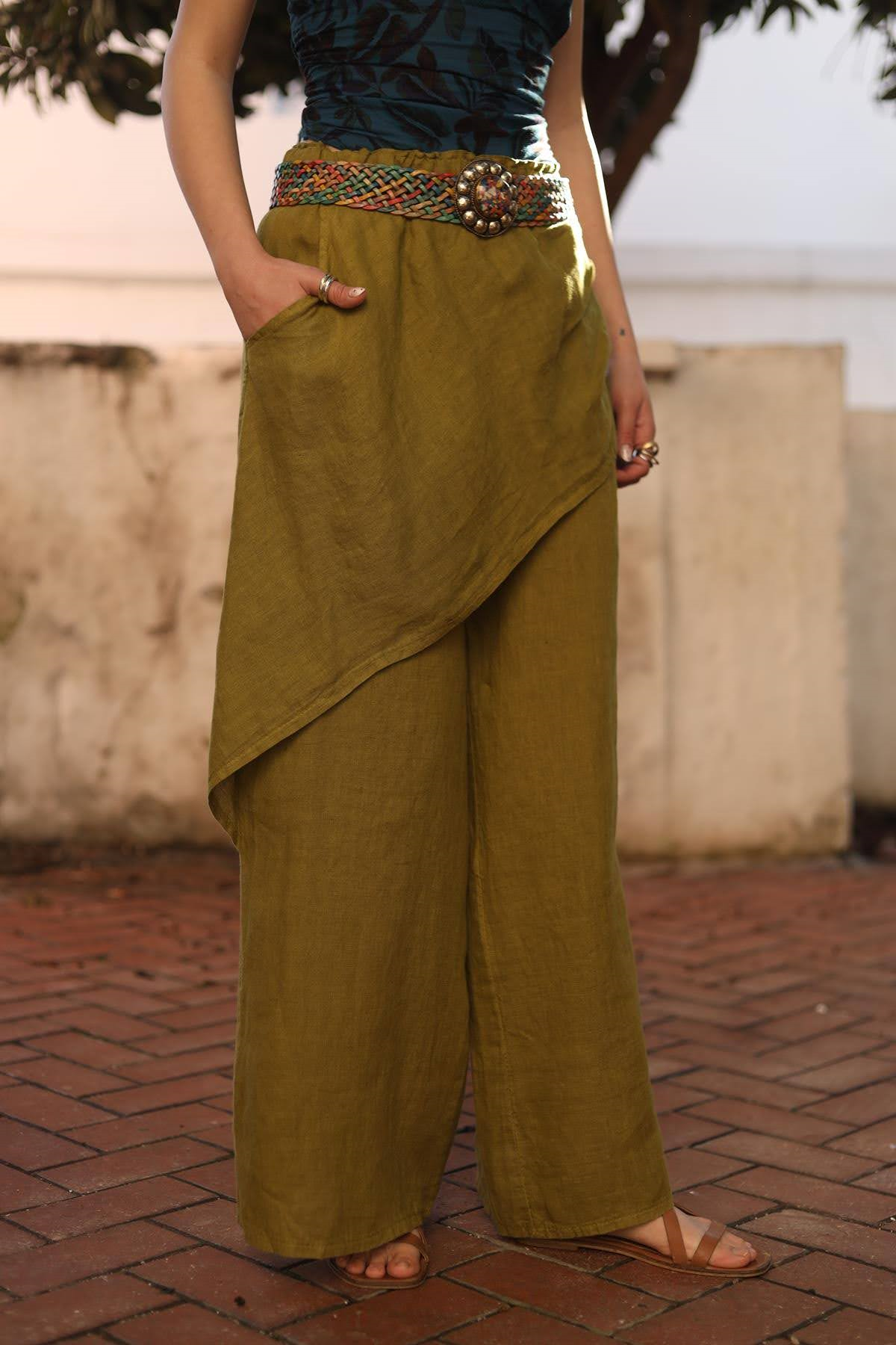 Yağ Yeşili Önü Kapaklı Keten Pantolon