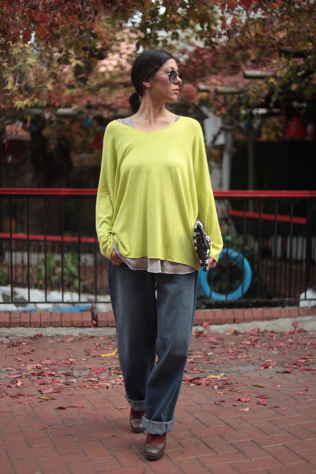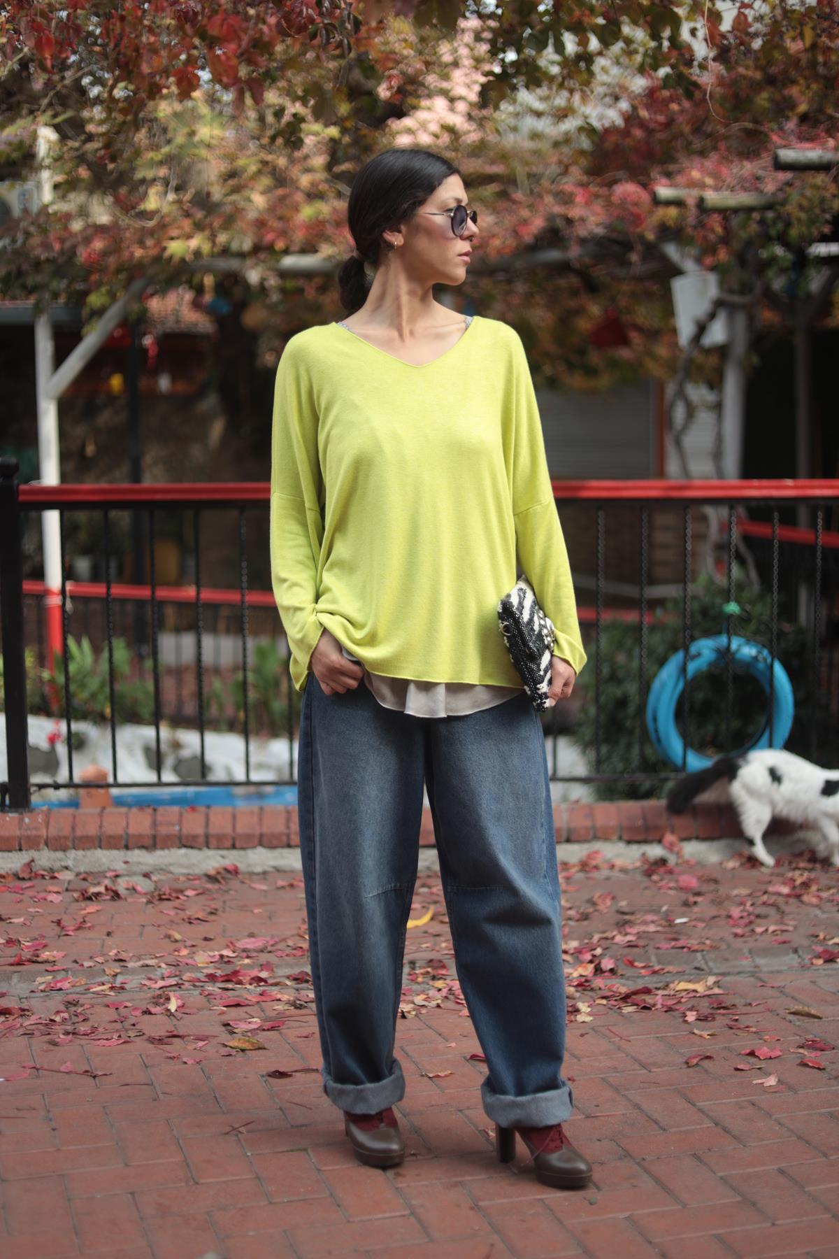 Yağ Yeşili V Yaka Yumuşak Doku Angora Bluz