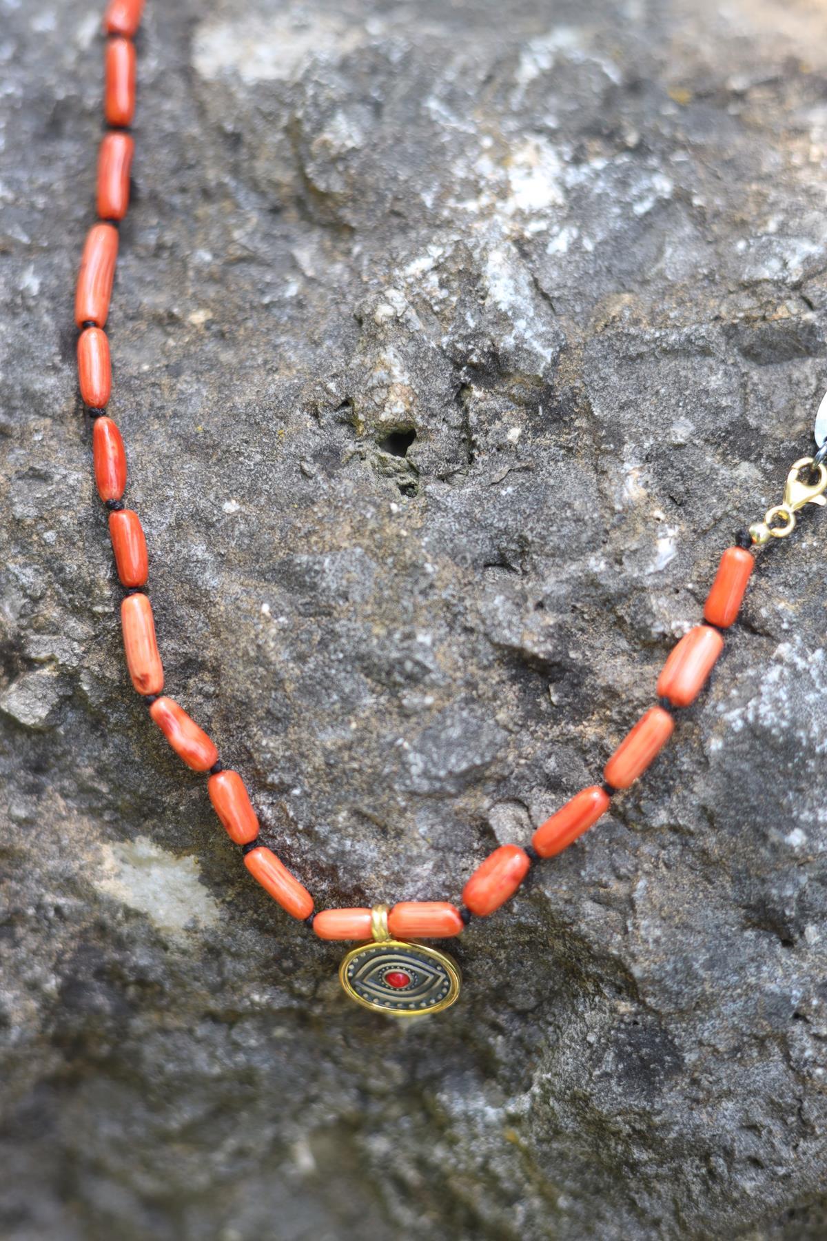 Eye Detailed Long Coral Silver Necklace (TA-KO-1515)