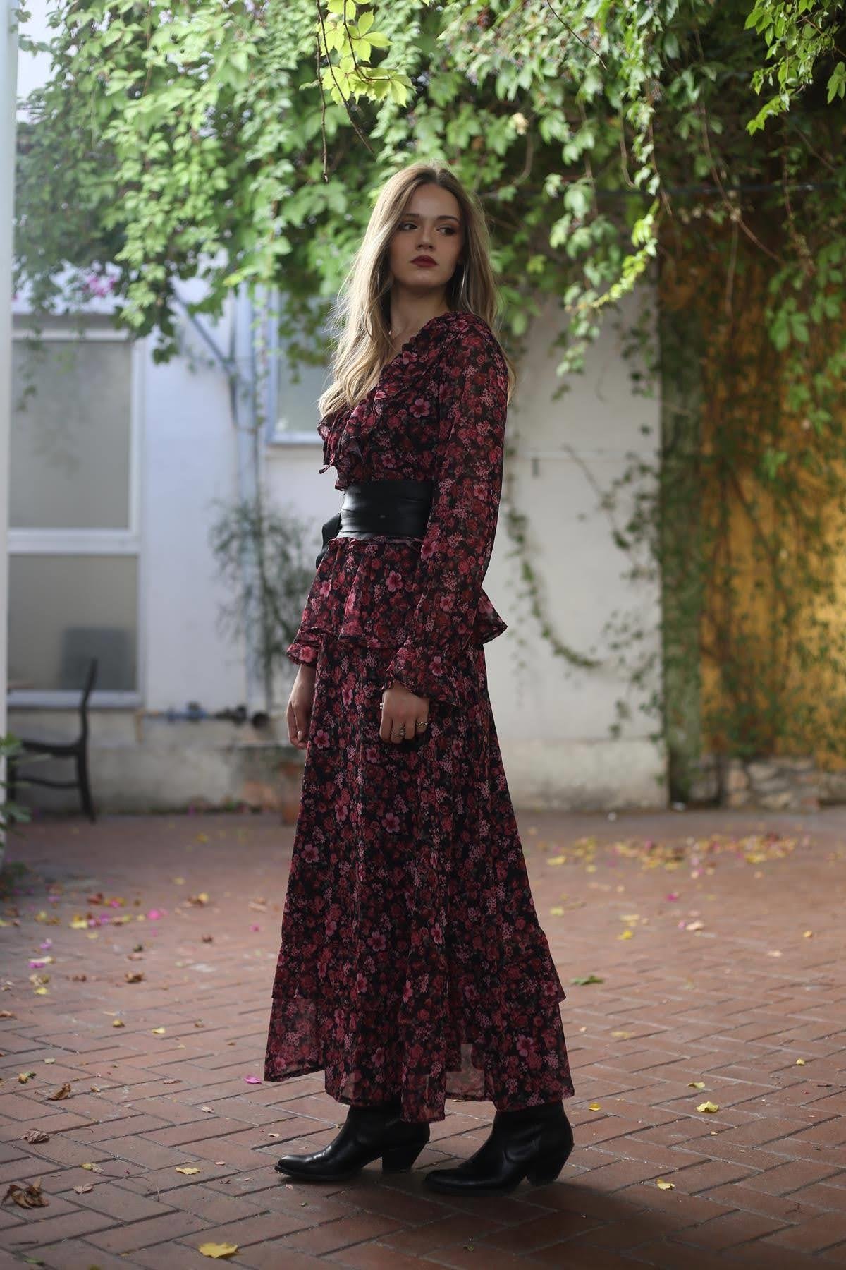 Fuşya Çiçek Desenli Volanlı Şifon Elbise