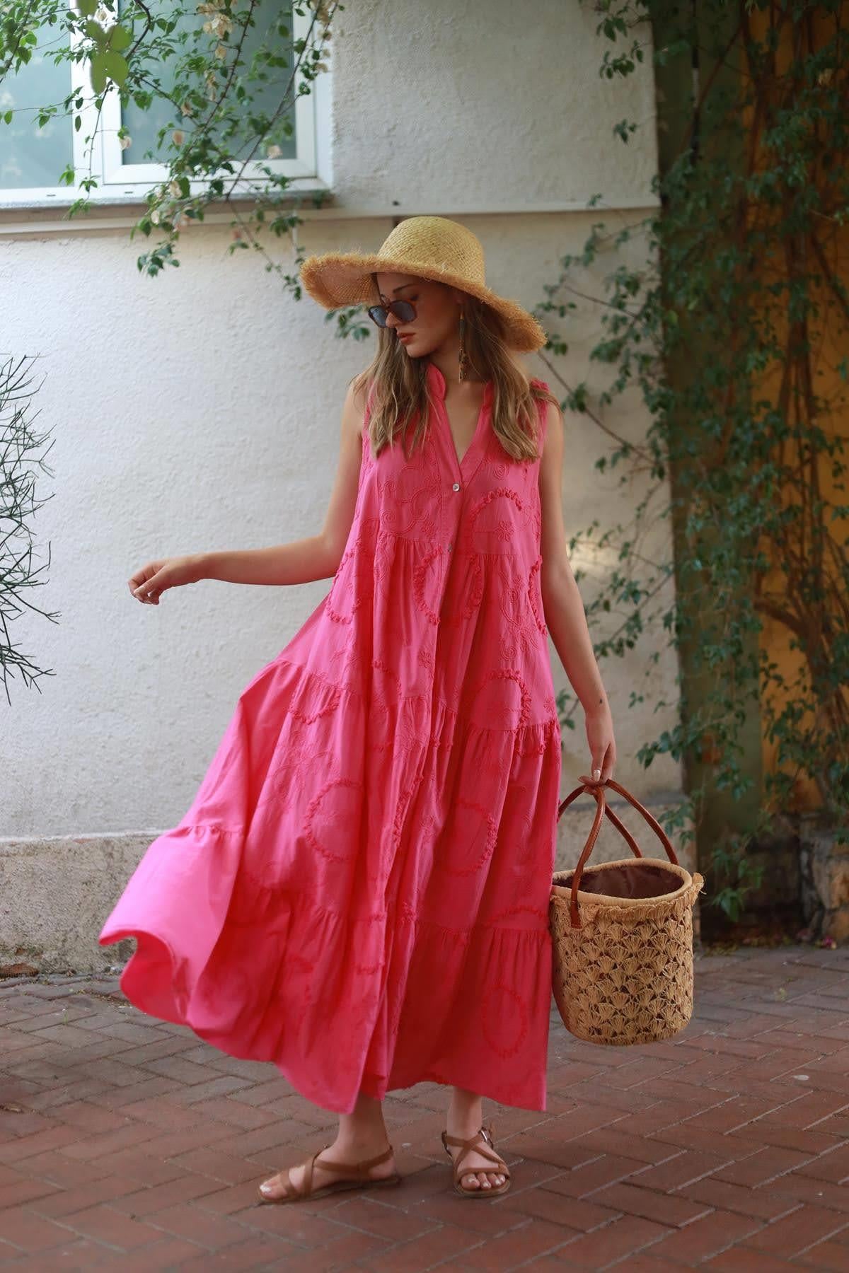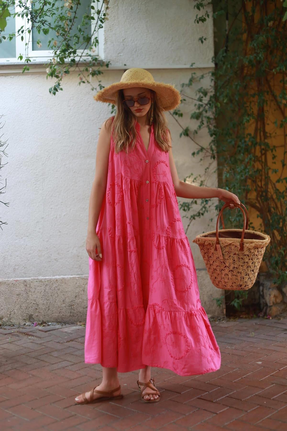 Fuşya Sarmaşık Çiçek İşlemeli Düğmeli Kolsuz Elbise (KE-PM-076-PA-FU-STD)