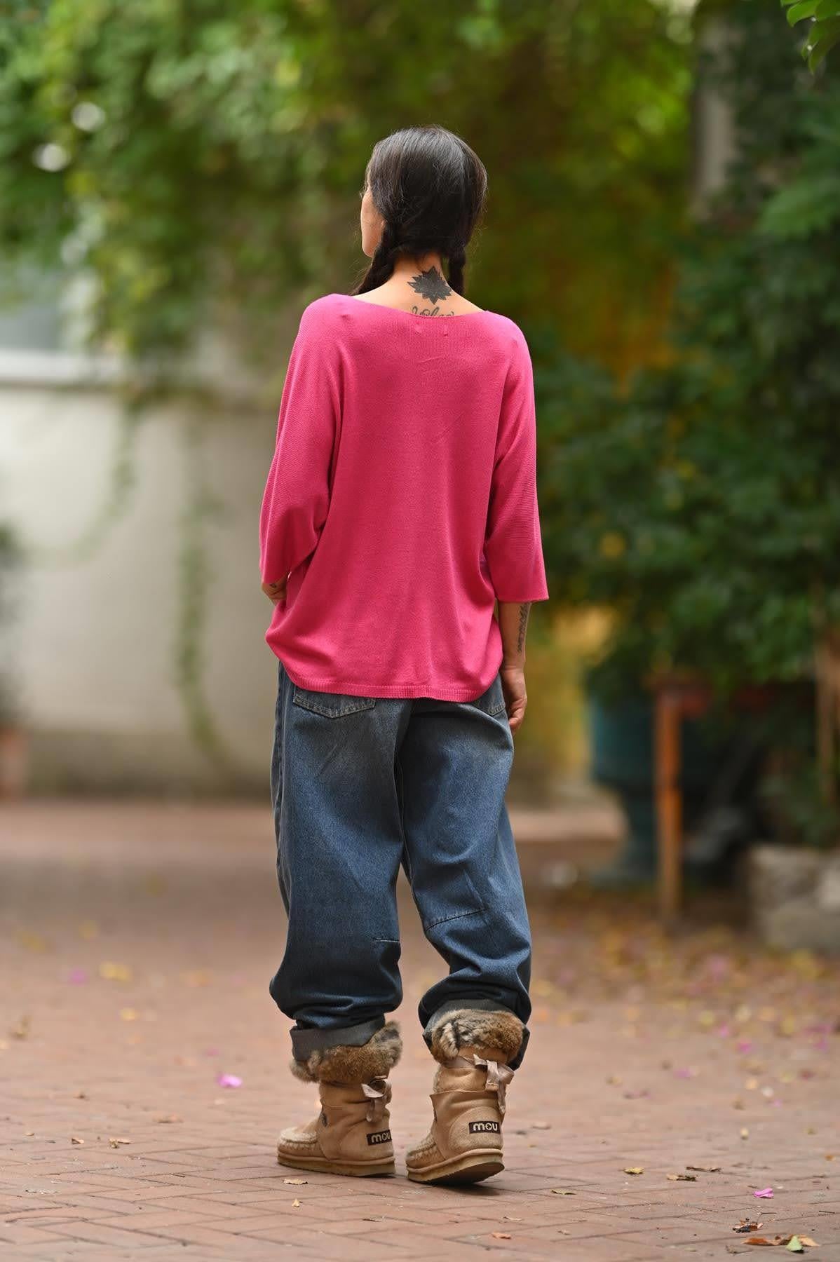 Fuşya V Yaka Modal Bluz