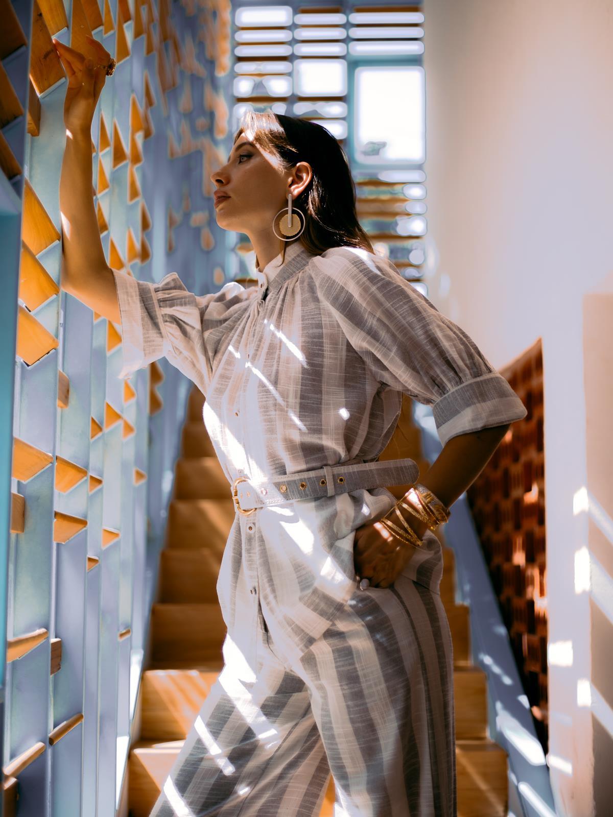 Gri Çizgili Truvakar Kol Gömlek ve Pantolon Takım