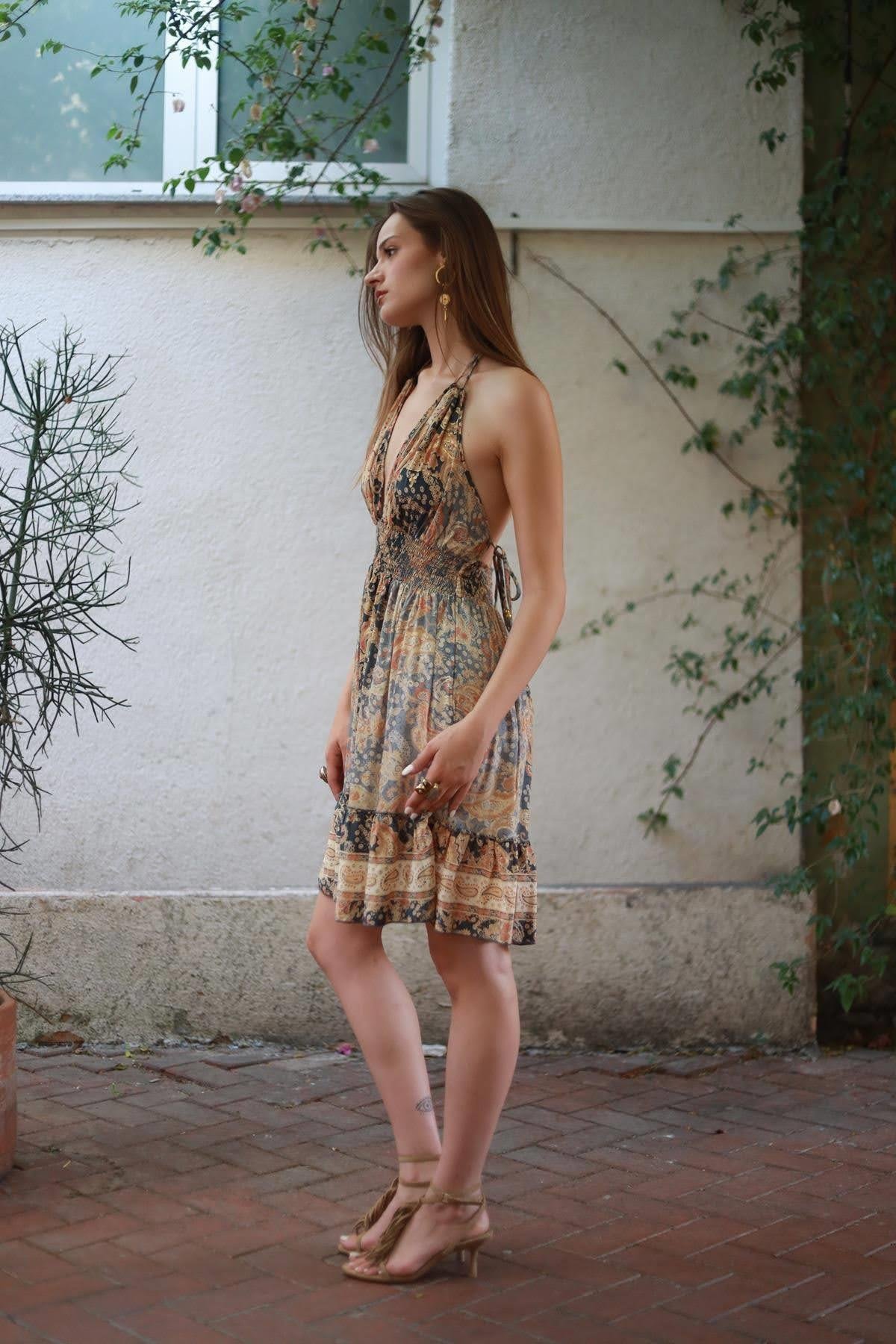 Gri Bağlamalı Sırt Dekolteli Mini İpek Elbise