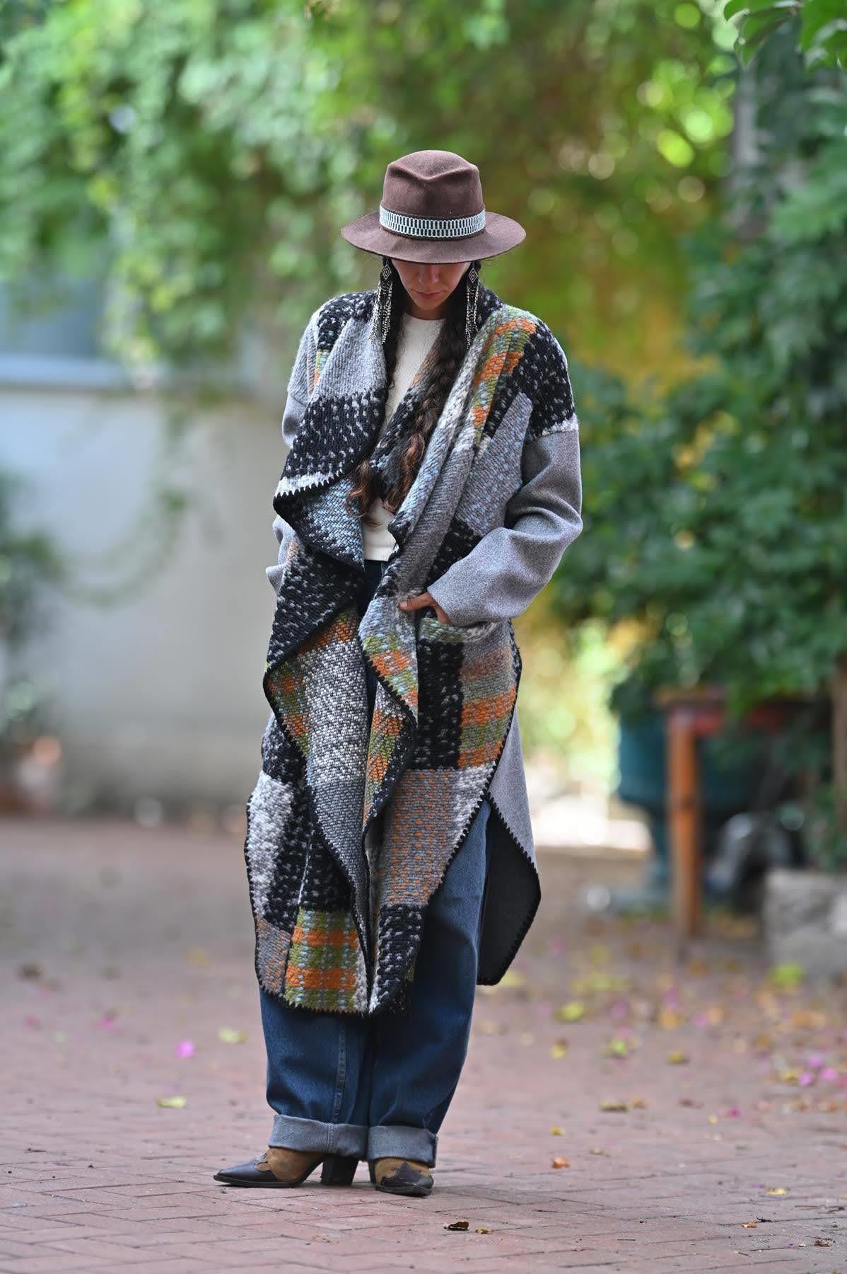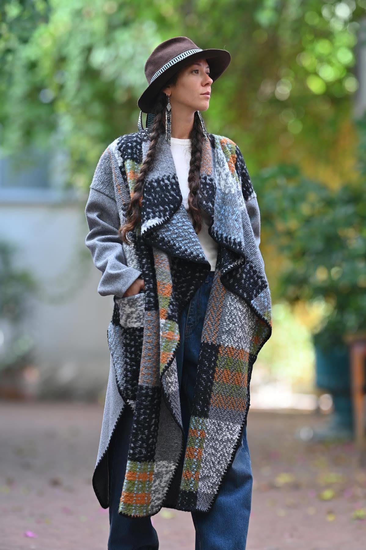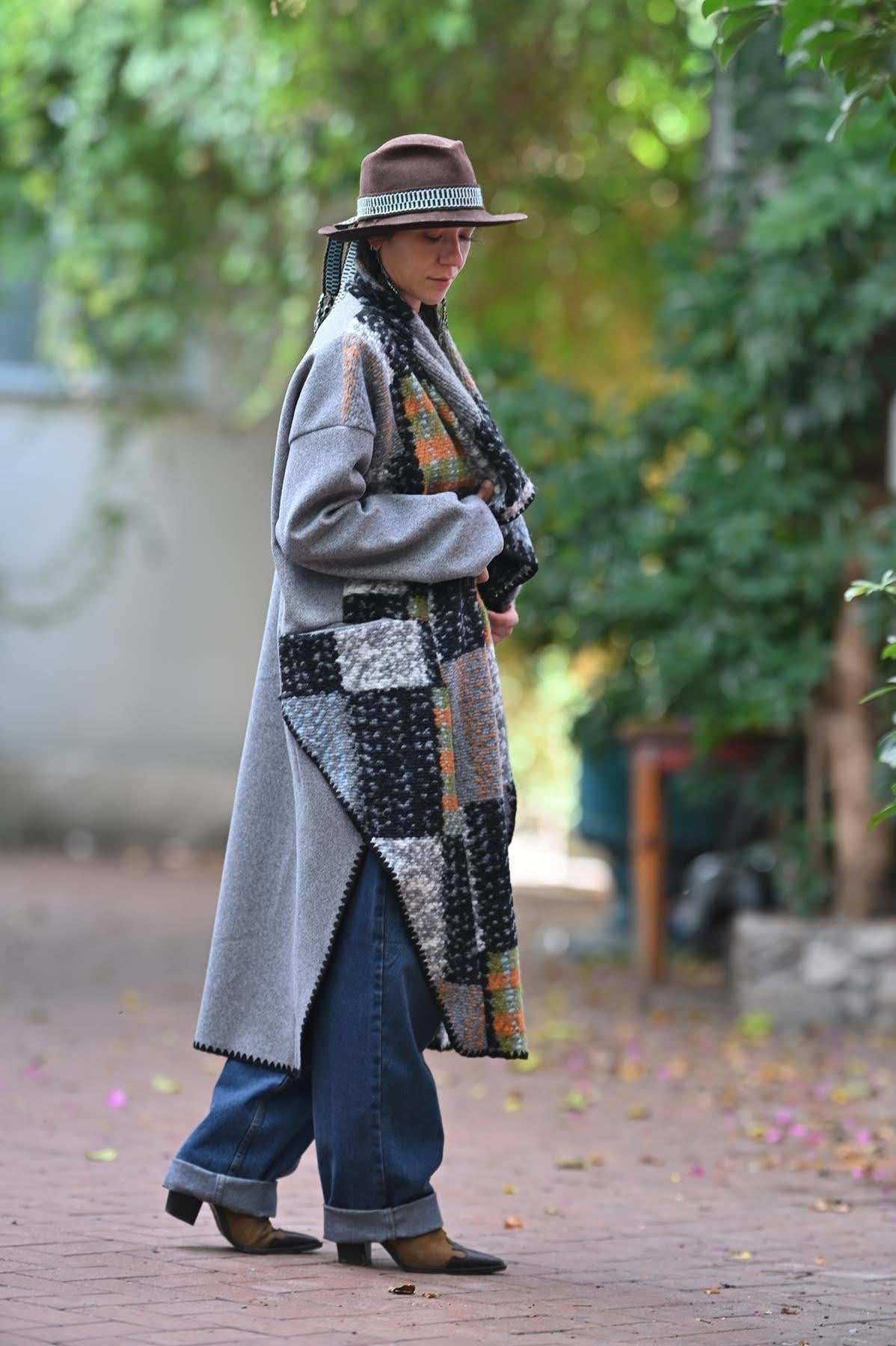 Gri Ekose Parça Detaylı Keçe Kaban