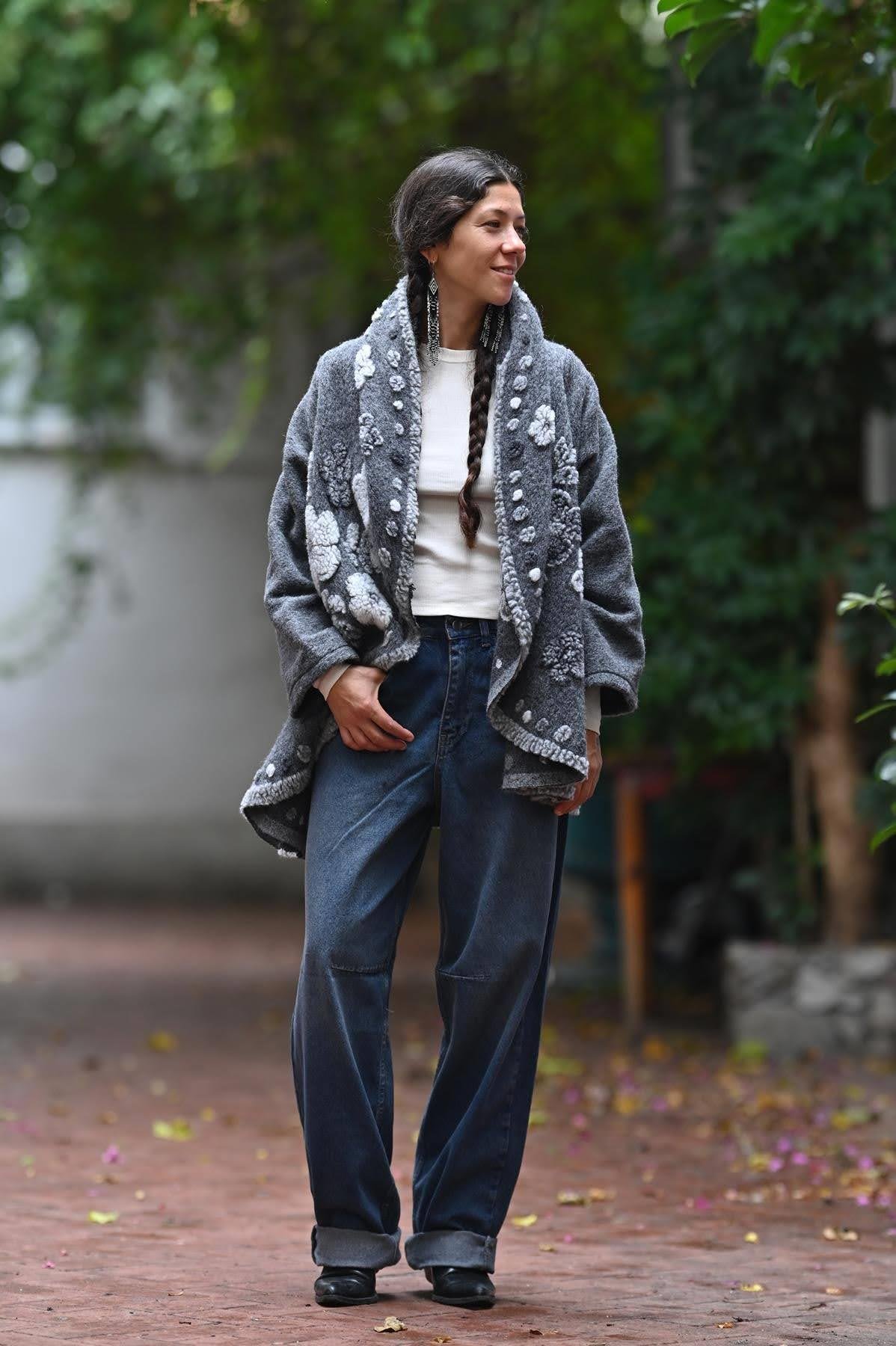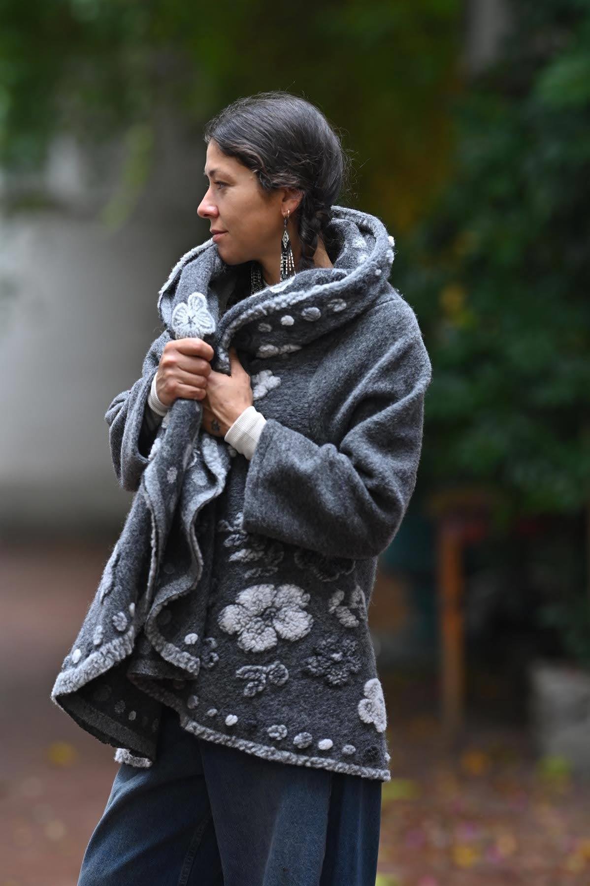 Gri Şal Yaka Çiçek Desenli Keçe Ceket