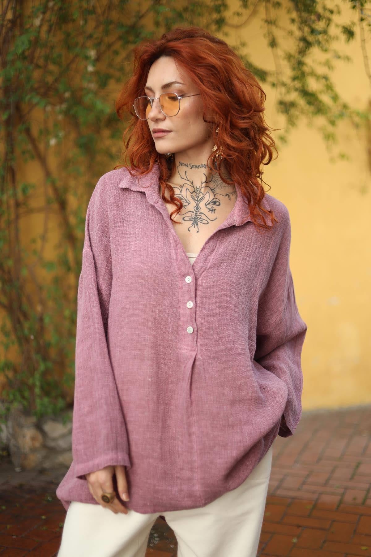 Gül Kurusu Gömlek Yaka Önü Pileli Keten Bluz