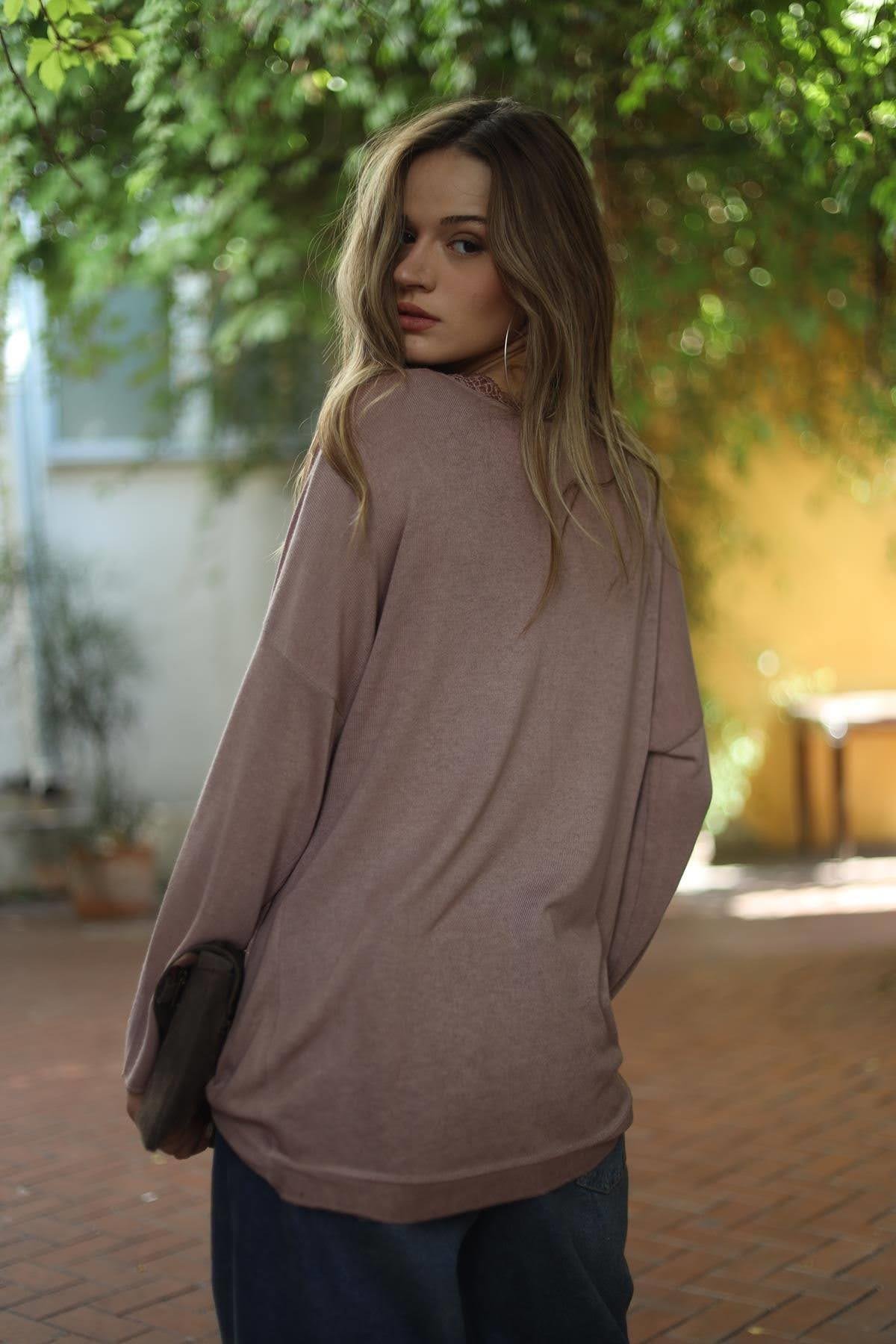 Gül Kurusu Yakası Dantelli Simli Yağ Yıkama Triko Bluz