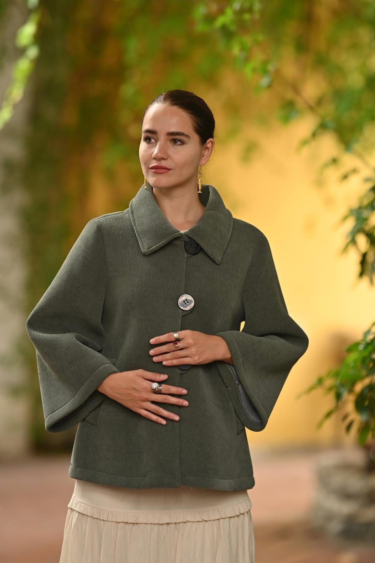 Haki Büyük Düğmeli Kolları Geniş Ceket
