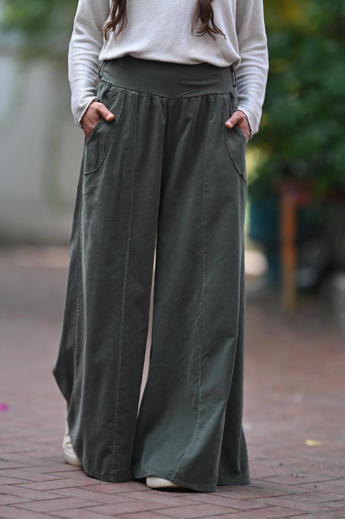 Haki Cebi Dikiş Detaylı Kadife Pantolon
