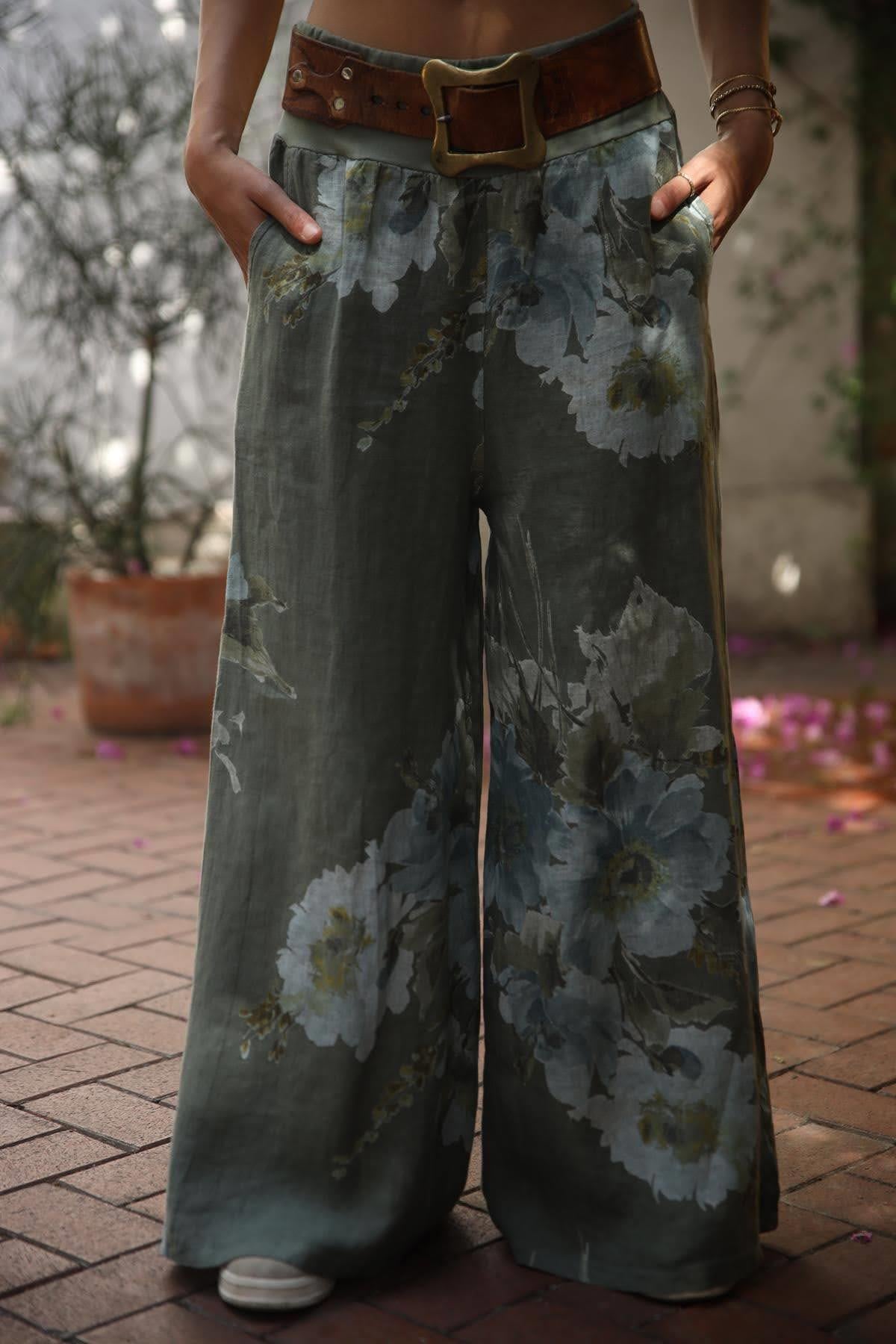 Haki Çiçek Desenli Beli Lastikli Asena Pantolon