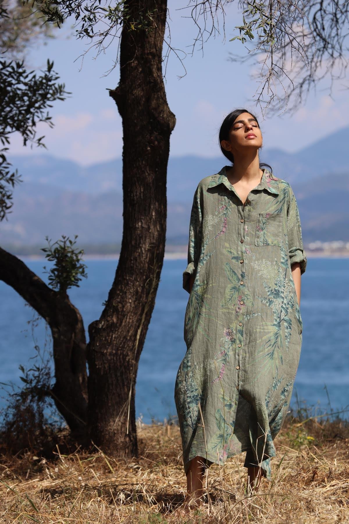 Haki Desenli Keten Gömlek Elbise (KE-AS-078-KTN-HA1-STD)