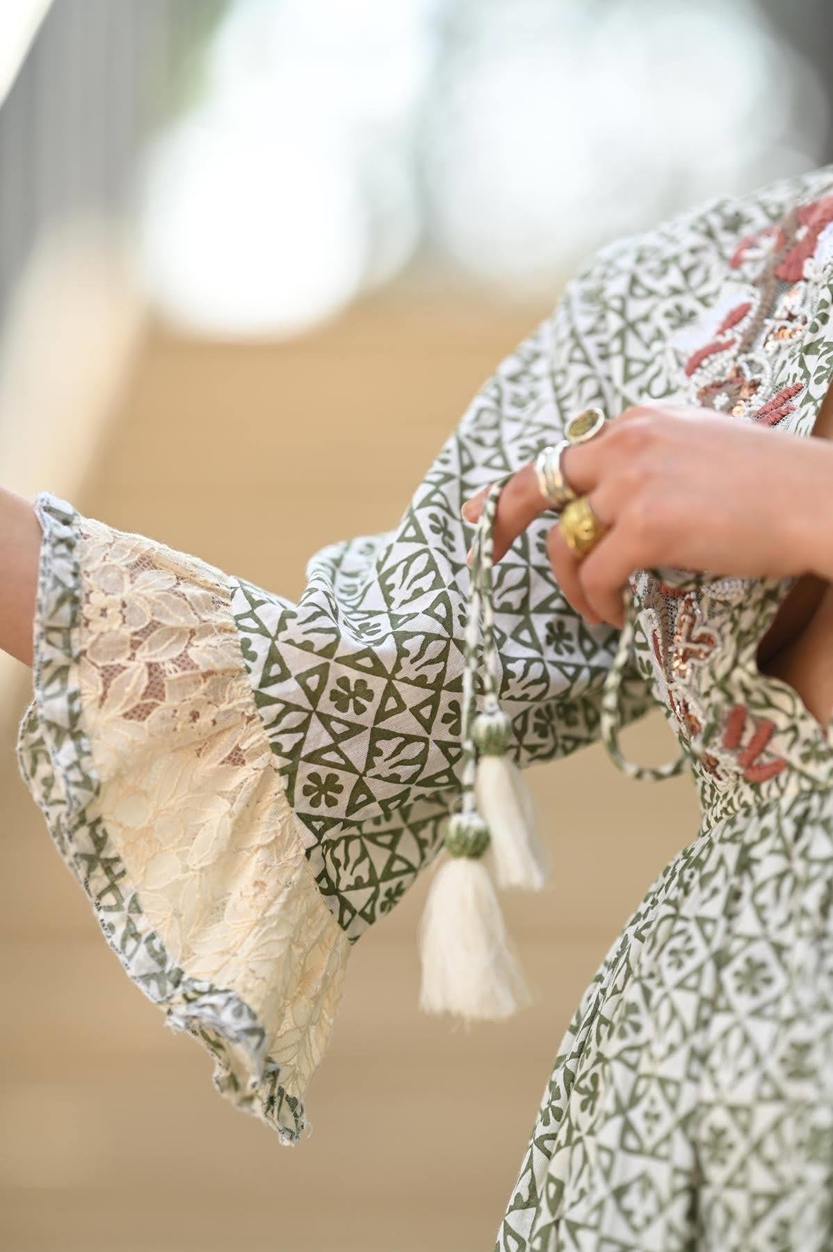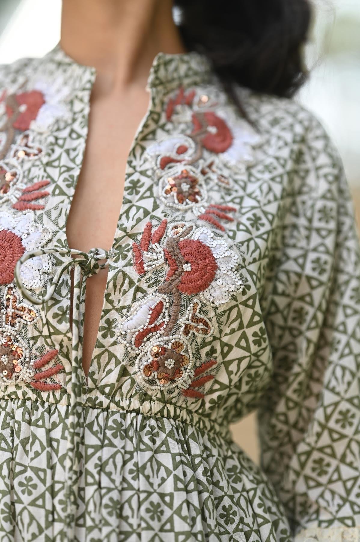 Haki Desenli Yaka Dekolteli Dantel Volanlı Mini Elbise (KE-SOL-002-PA-HA-STD)