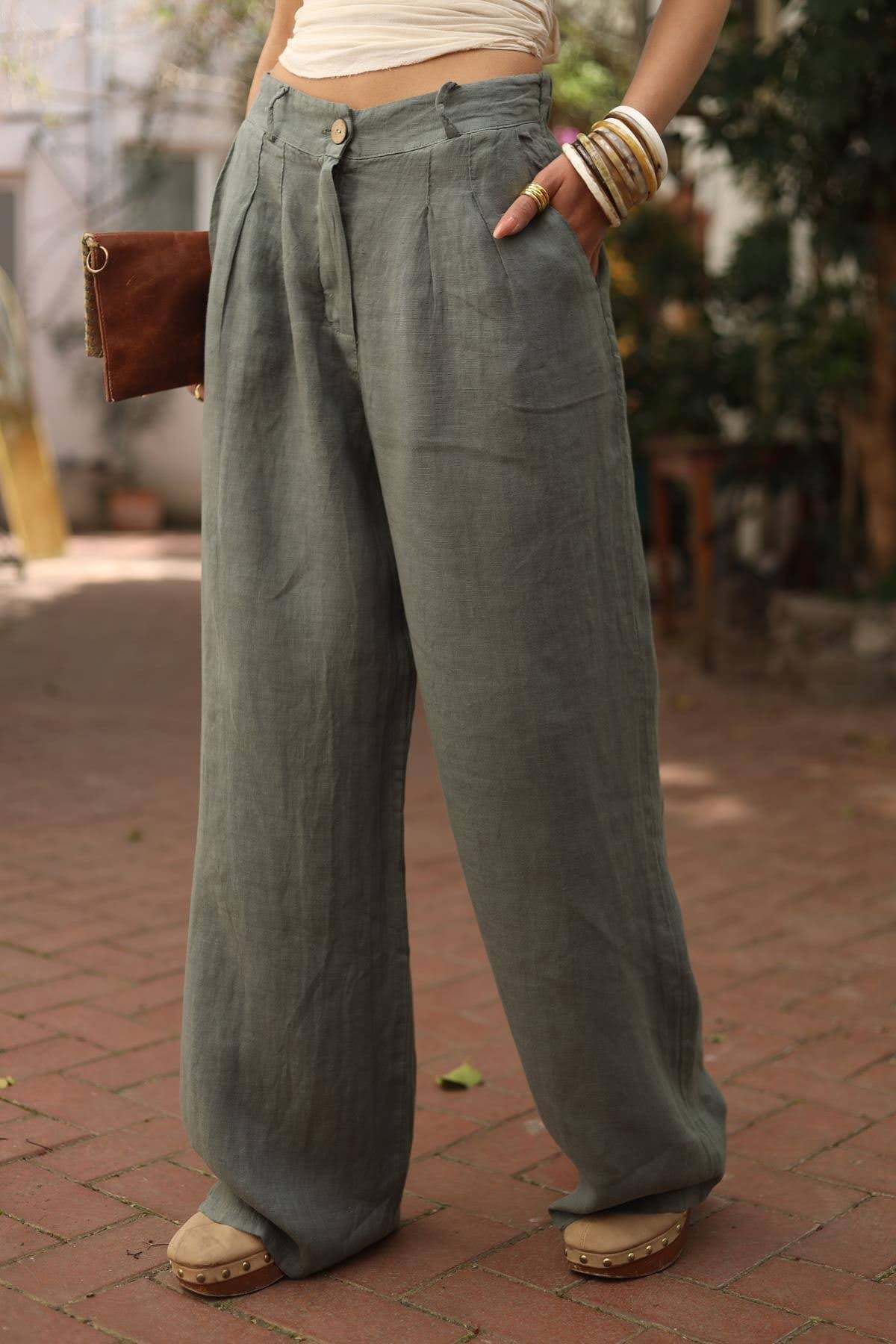 Haki Düğme Detaylı Fermuarlı Keten Pantolon