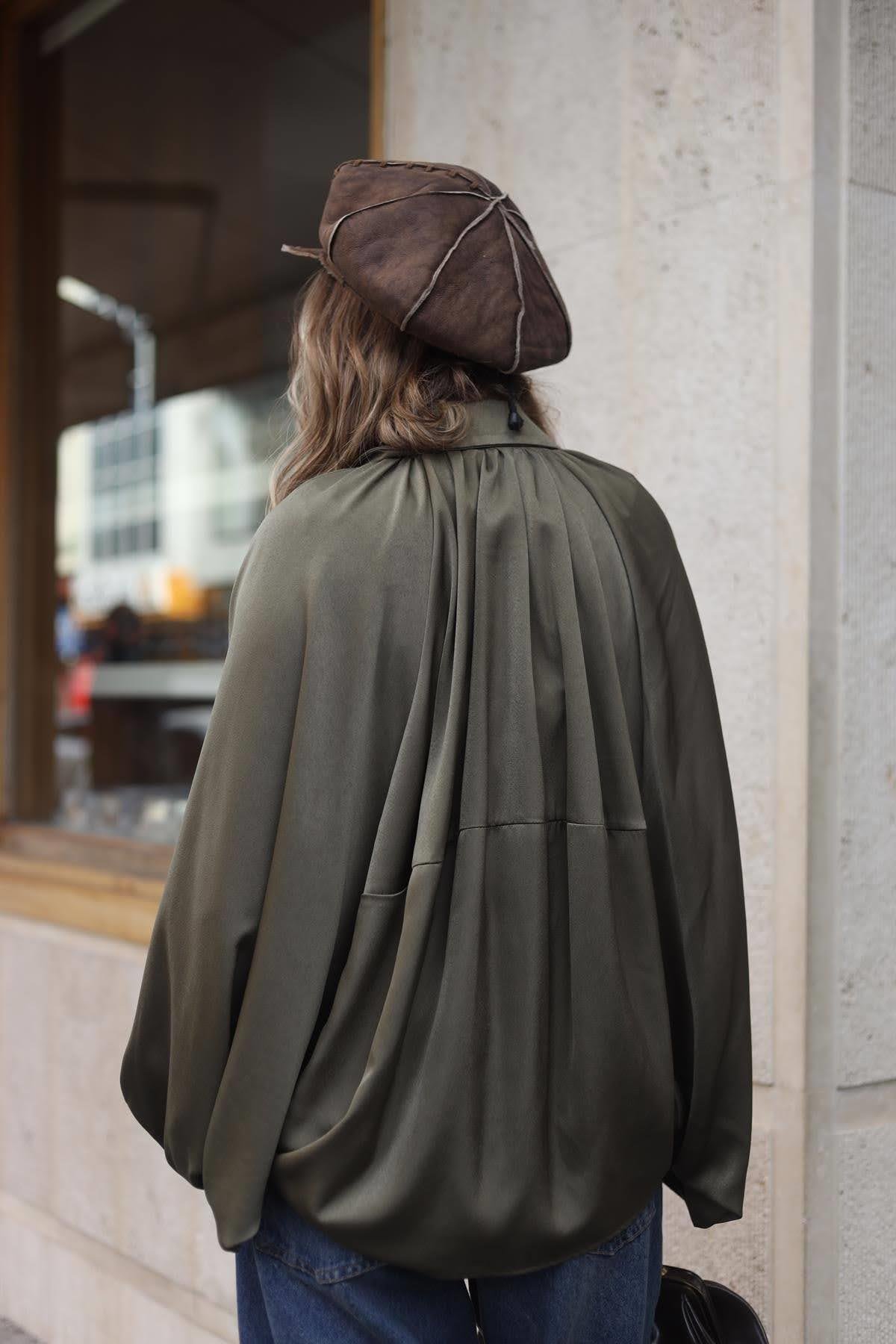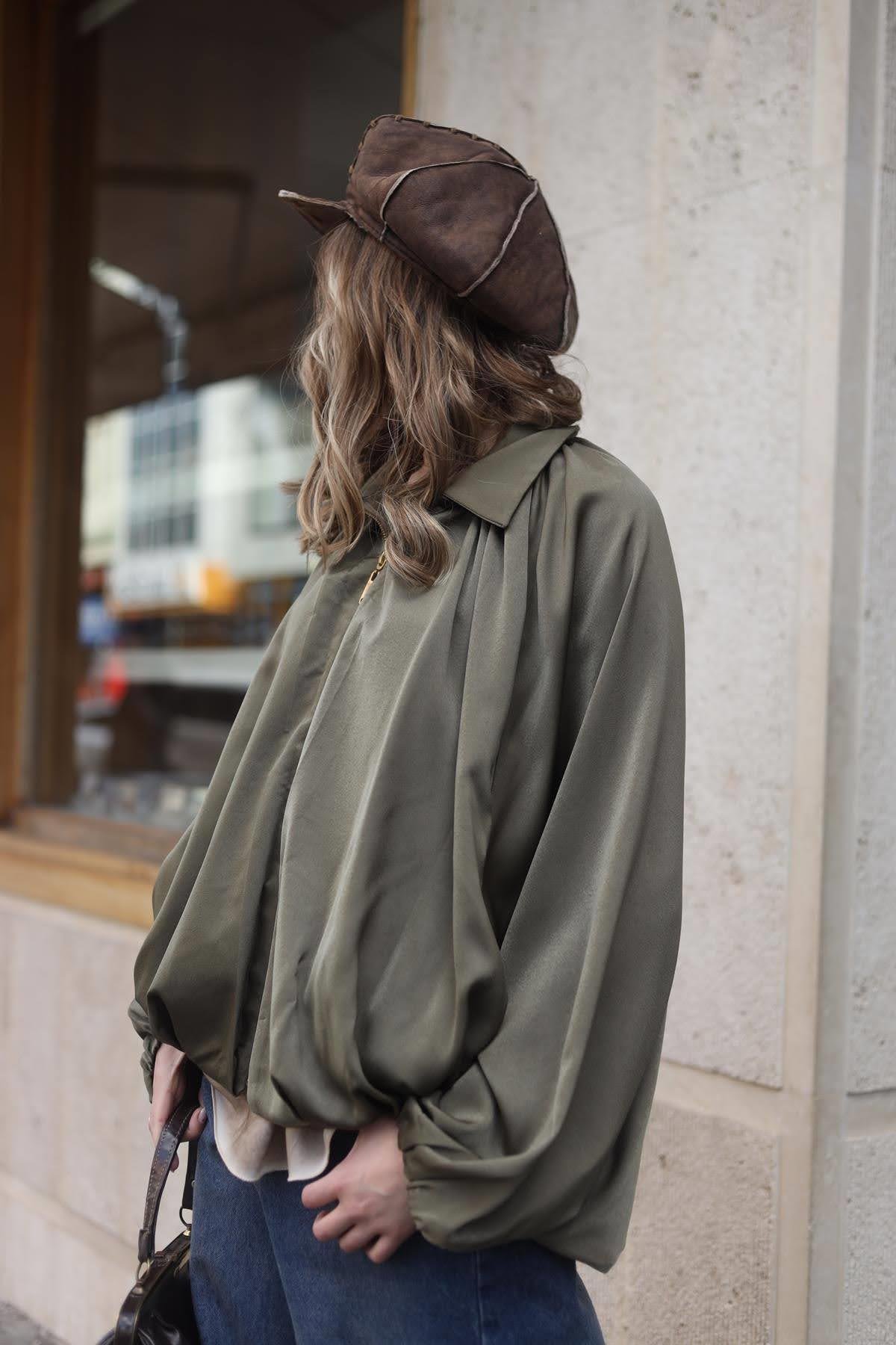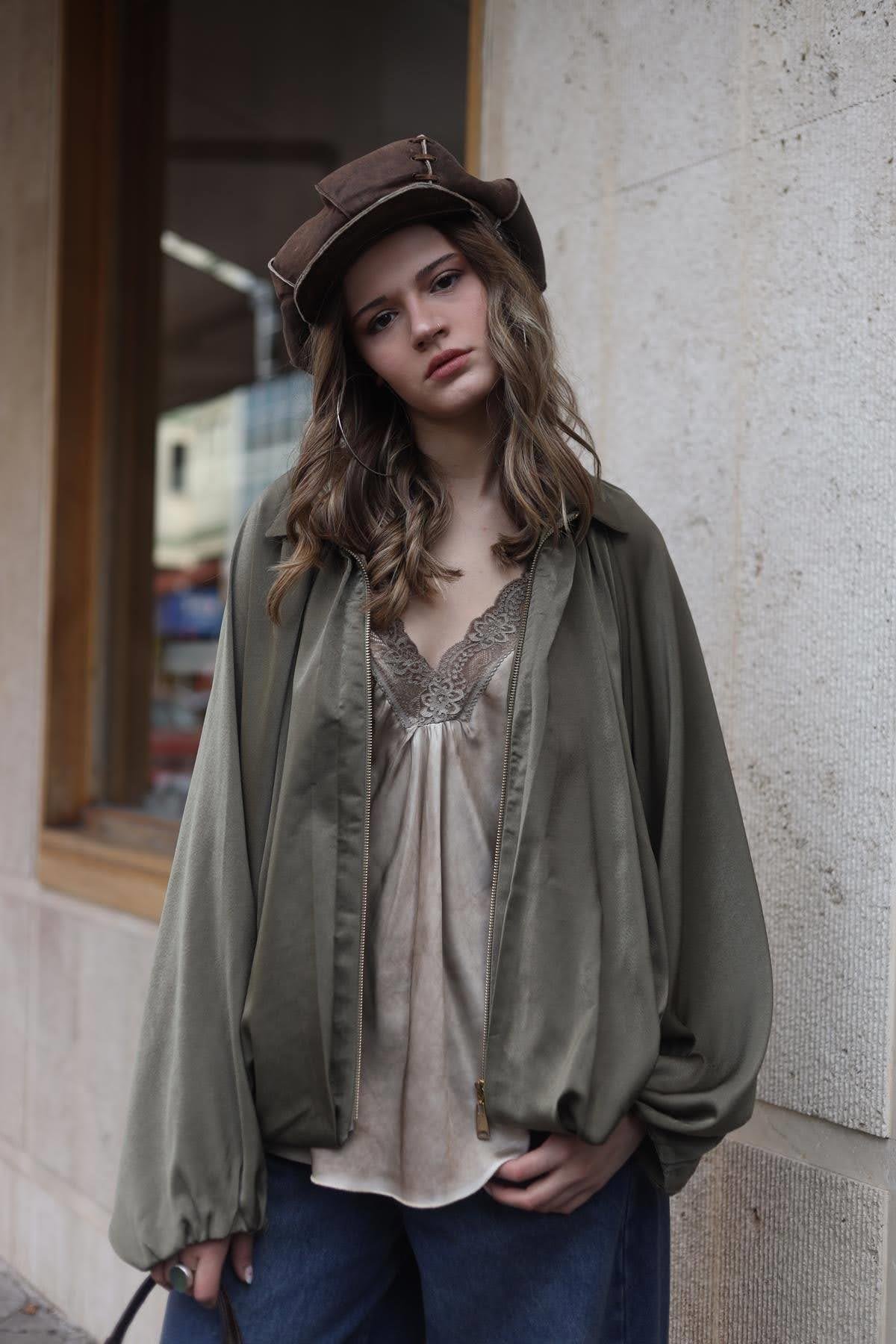 Haki Fermuarlı Yarasa Kol Saten Ceket