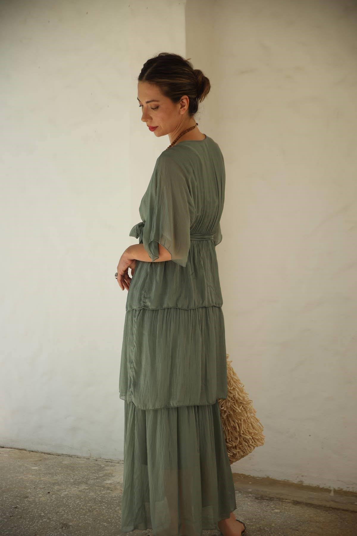 Haki Kruvaze Yaka Belden Bağlamalı İpek Elbise (KE-DOT-005-VI-HA-STD)