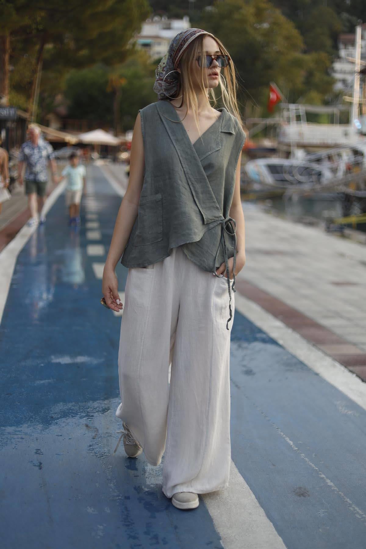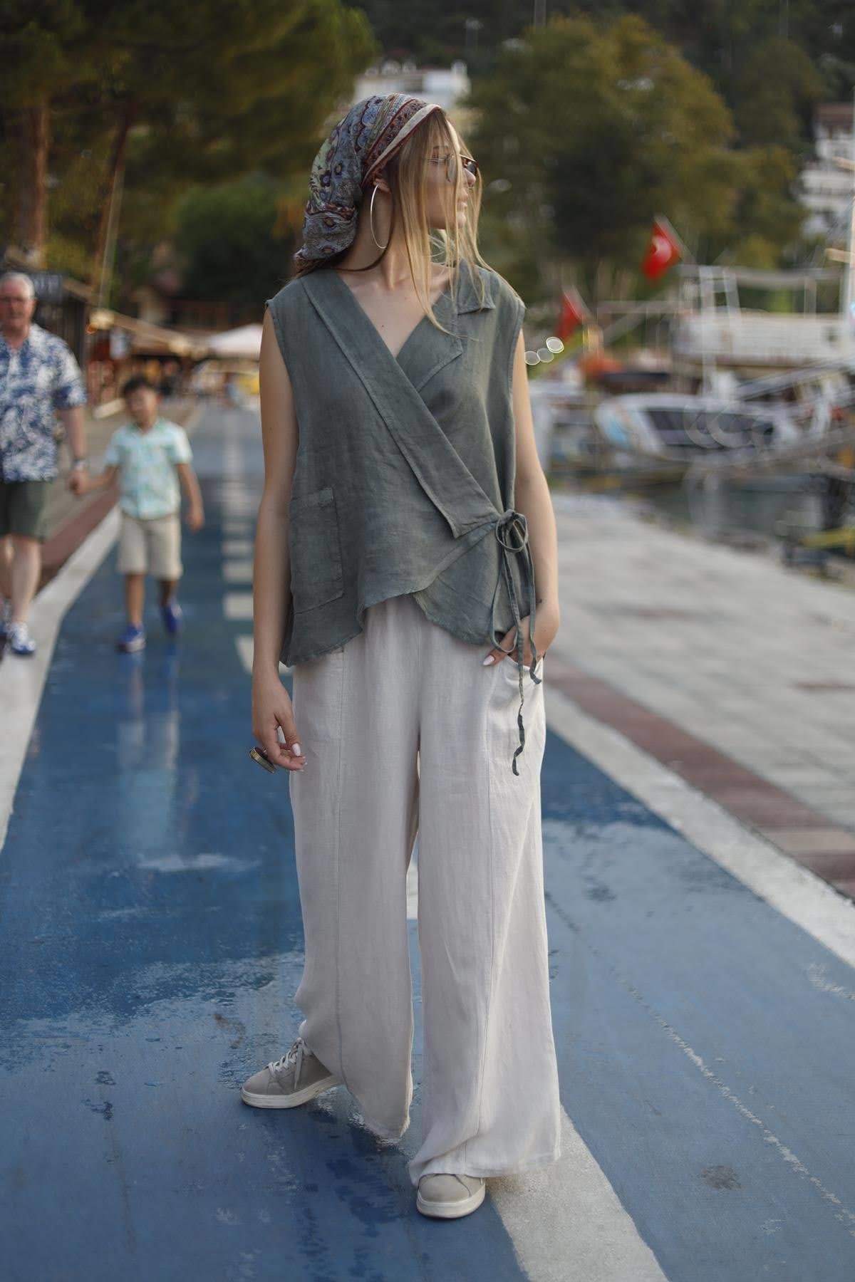 Haki Sıfır Kol Kruvaze Keten Bluz (KB-PM-032-KTN-HA1-STD)