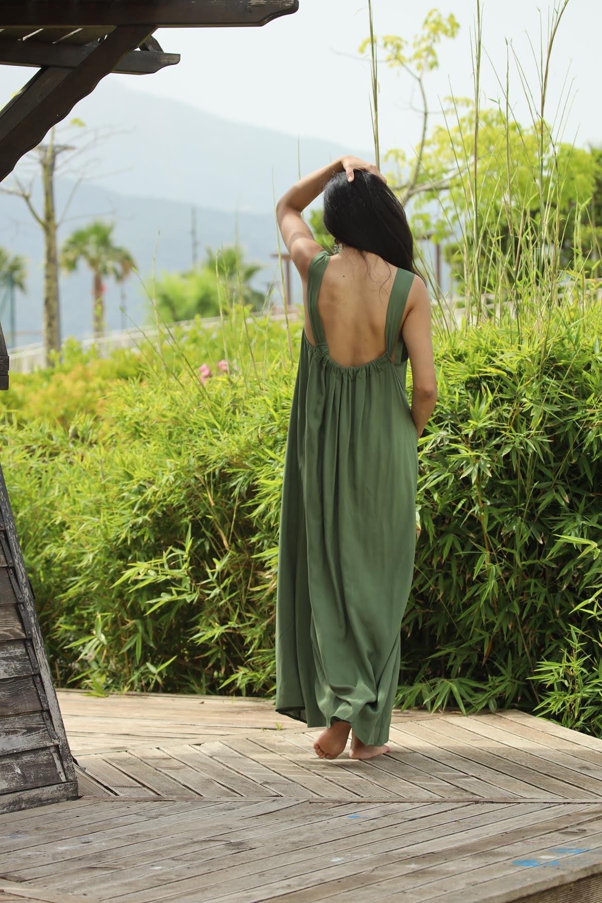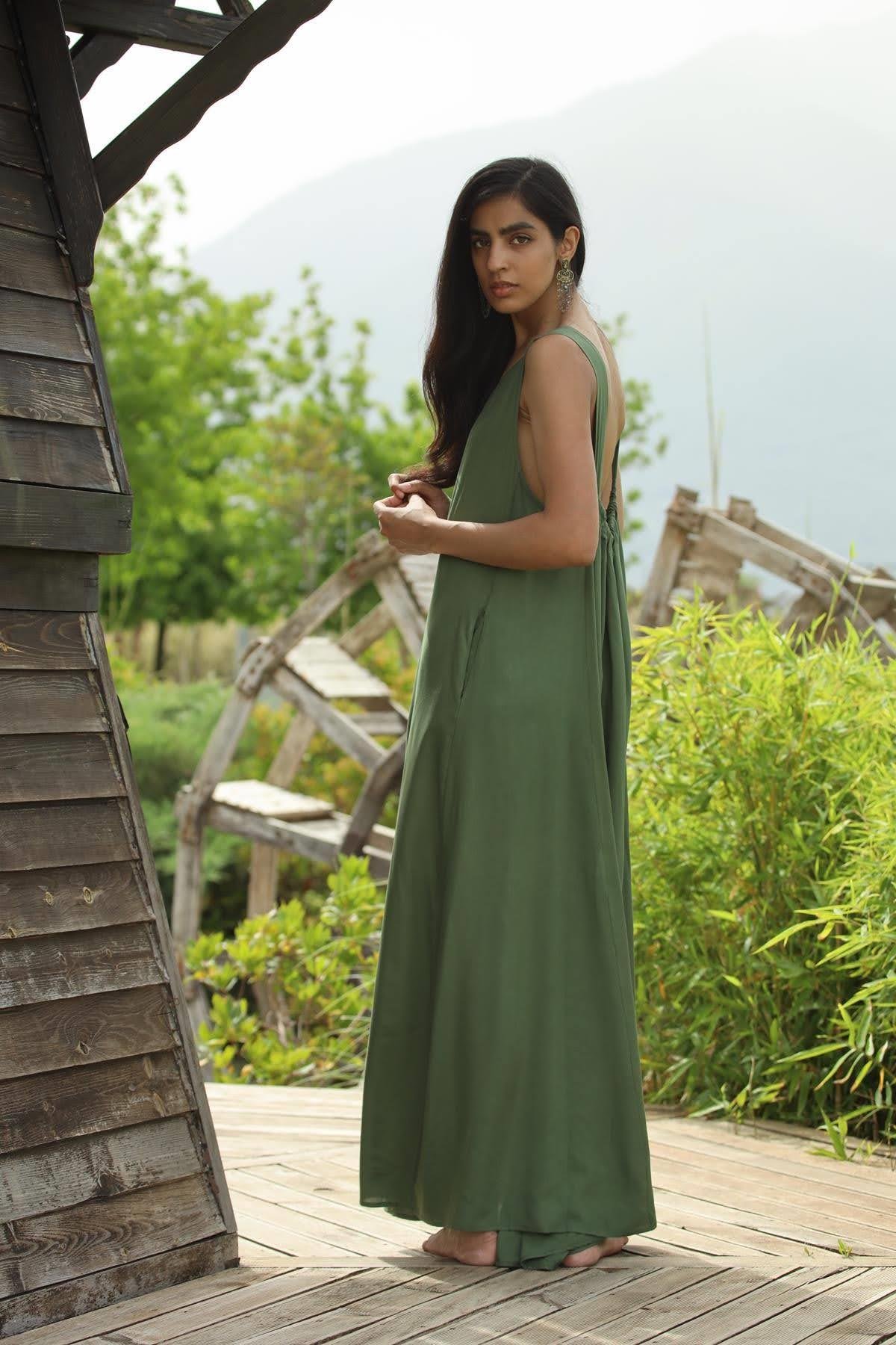 Haki Sırt Detaylı Askılı Maxi Elbise