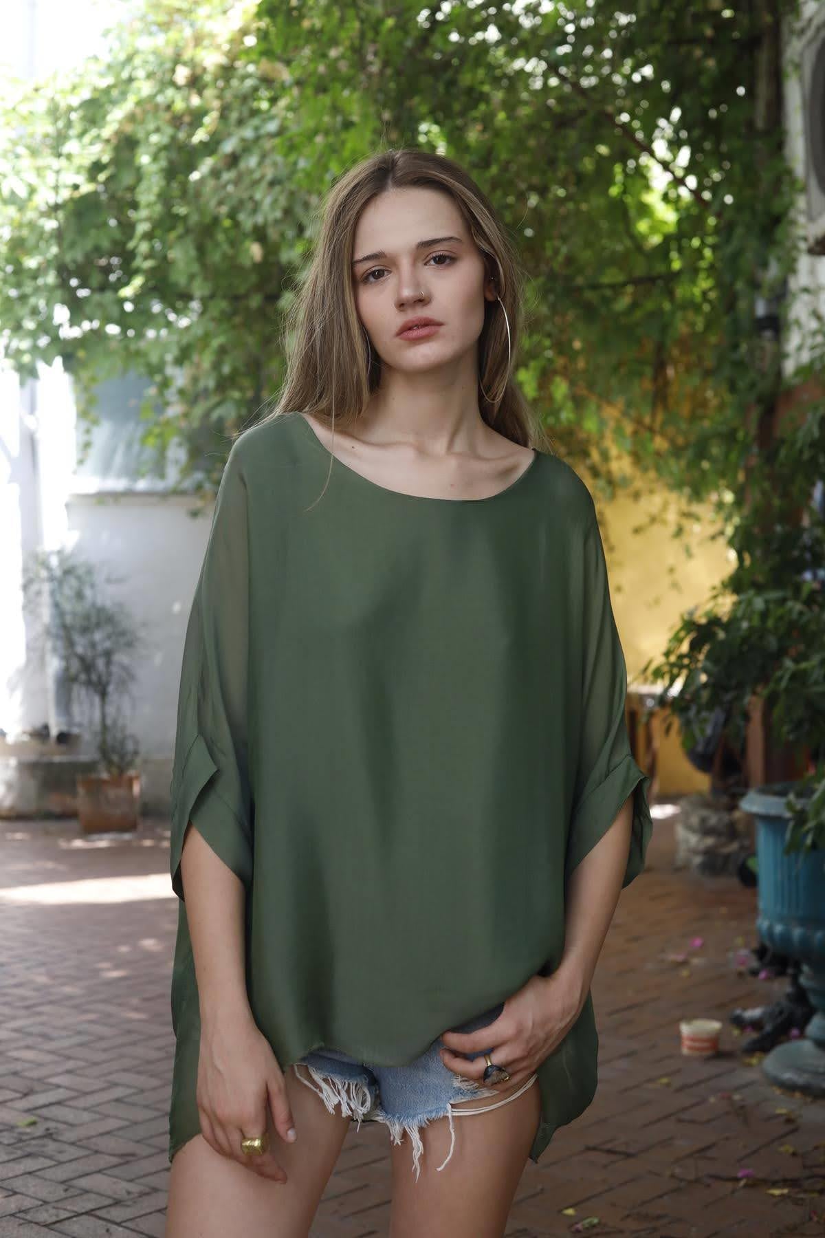 Haki Sırtı Bağlamalı İpek Bluz (KB-PM-051-IP-HA-STD)