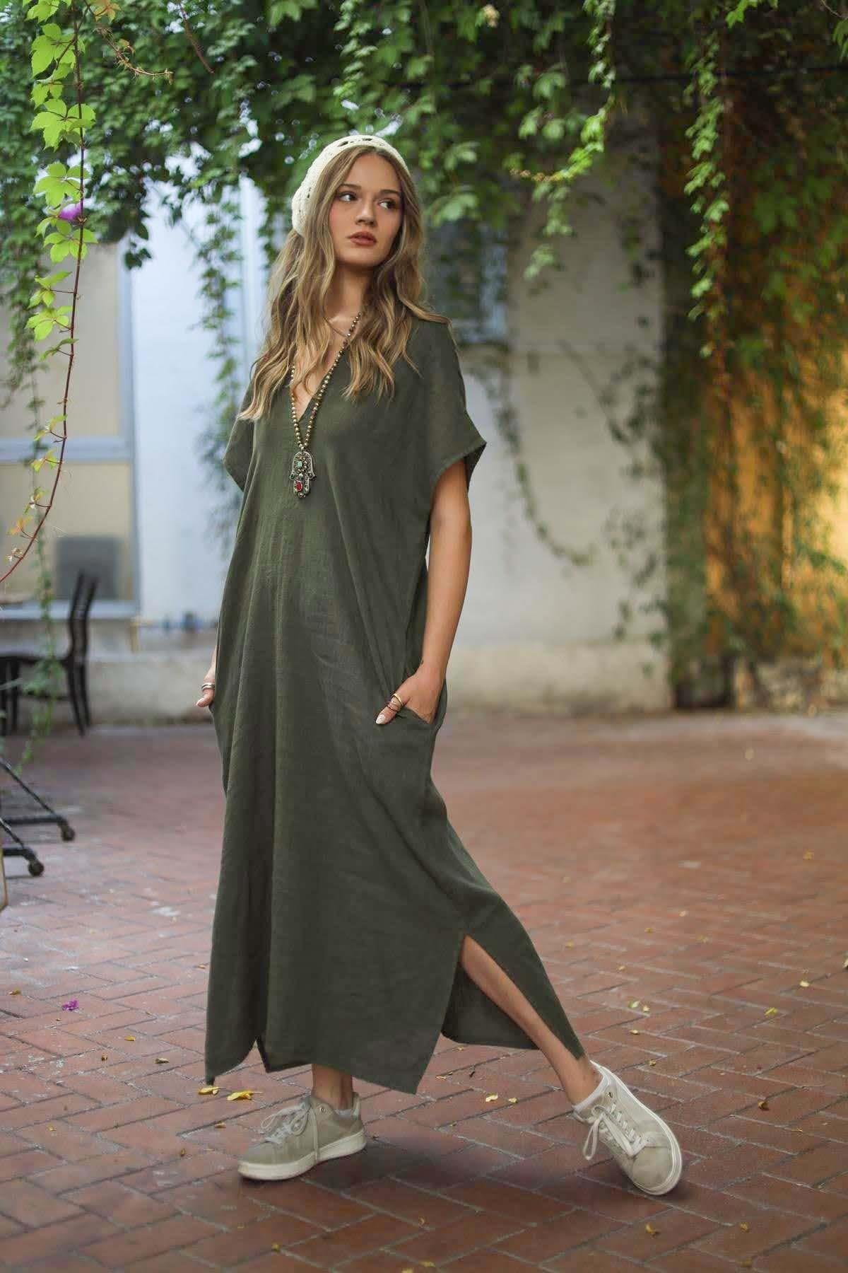 Haki Sırtı Bağlamalı Yırtmaçlı Keten Elbise (KE-DOT-002-KTN-HA-STD)