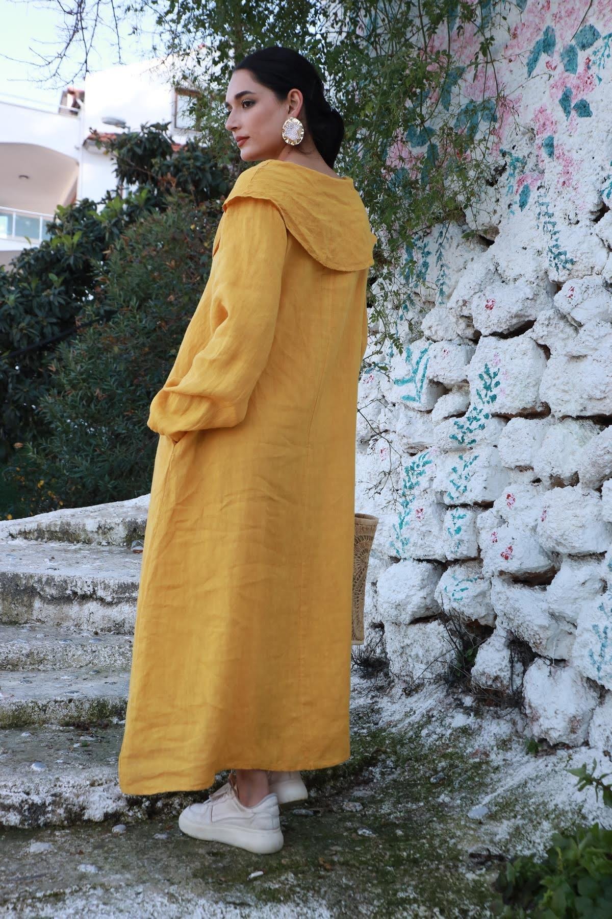 Hardal Rengi Degaje Yaka Keten Elbise (KE-PM-053-KTN-HAR-STD)