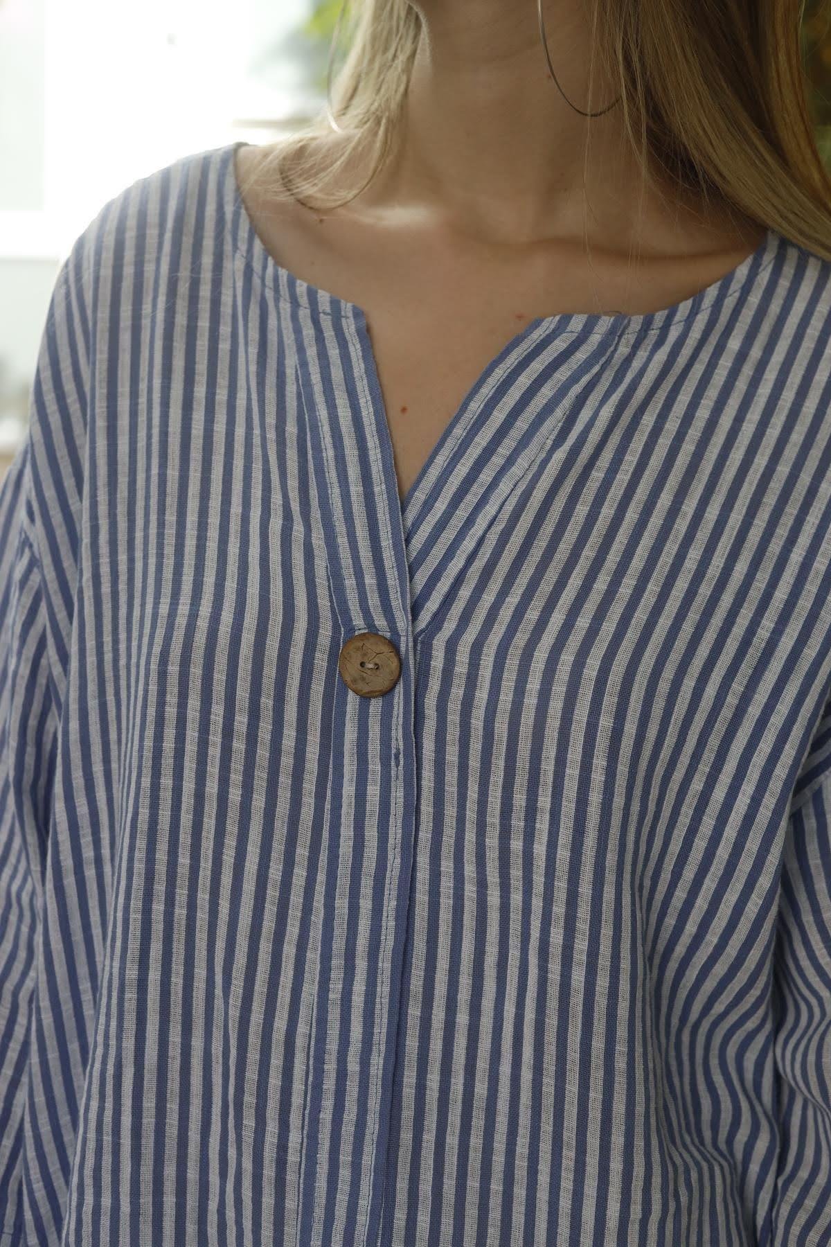 İndigo Mavi Çizgili Tek Düğmeli Tunik