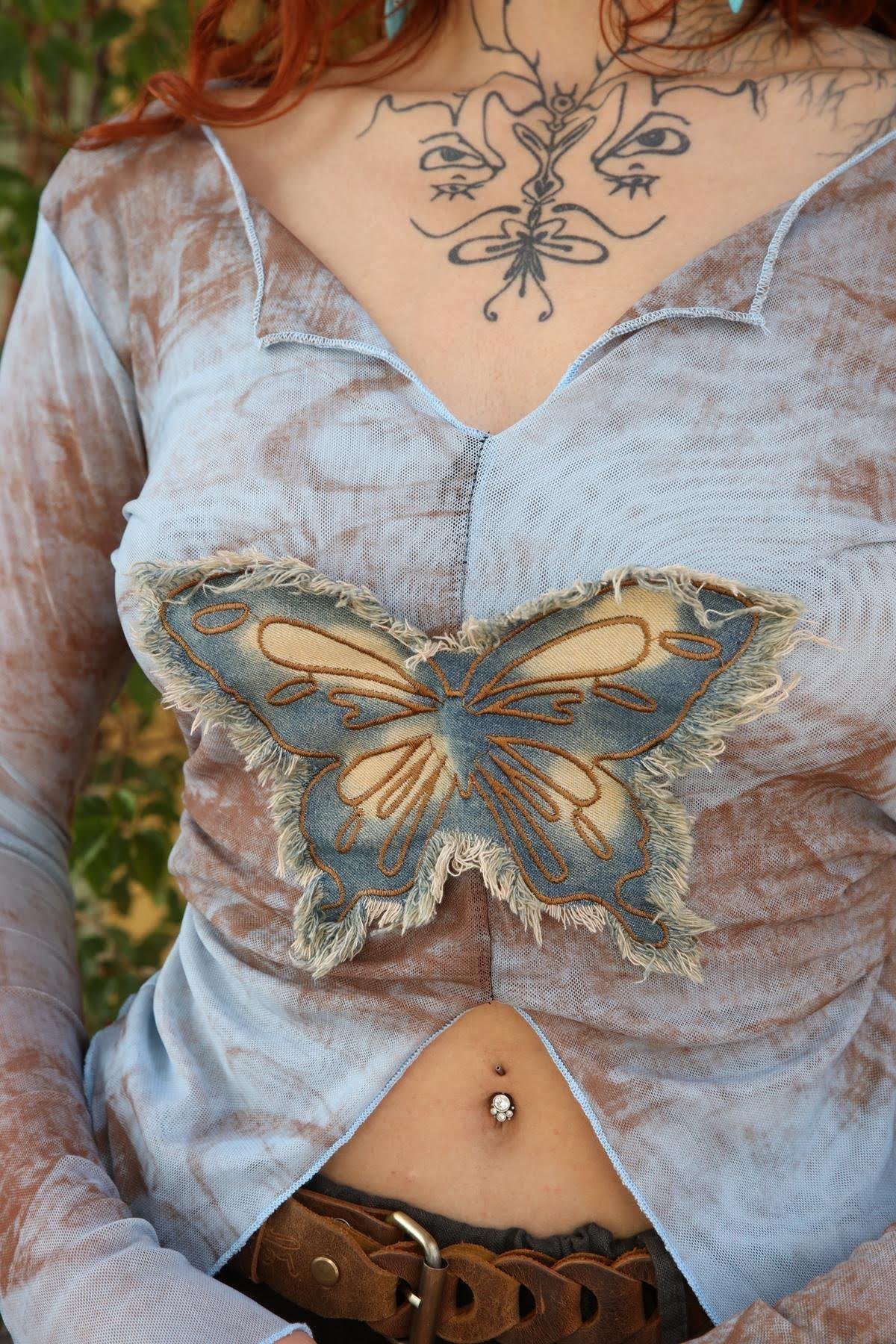 İndigo Mavi Kelebekli Önü Kısa Drapeli Tül Bluz