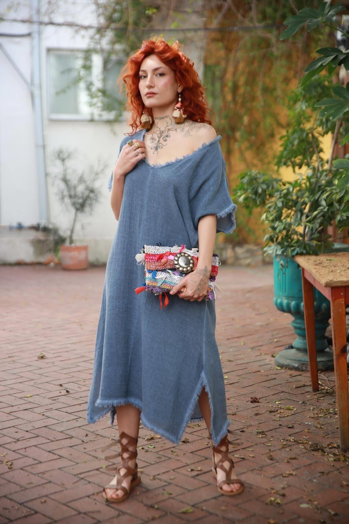 İndigo Mavi Püsküllü V Yaka Yırtmaçlı Elbise