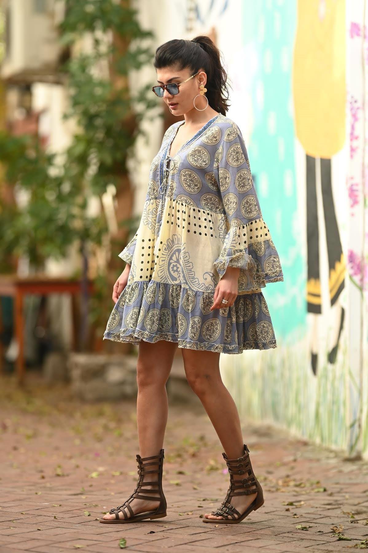 İndigo Mavi Yakası Boncuk İşlemeli Volanlı Mini Elbise (KE-SOL-001-PA-IND-STD)