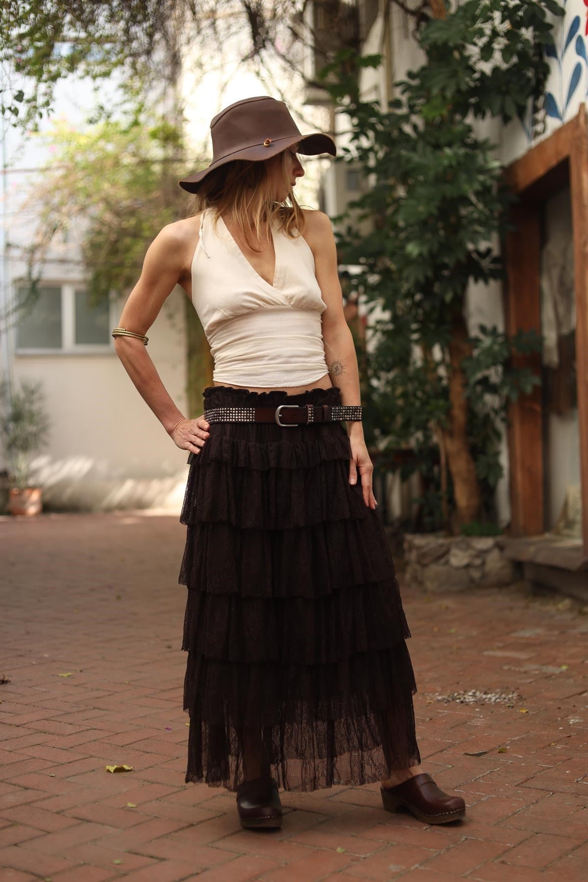 Kahverengi Astarlı Kat Kat Tül Etek