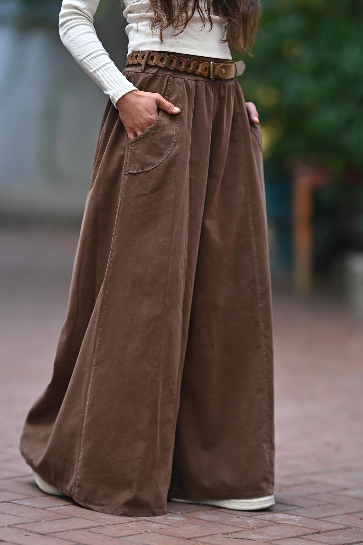Kahverengi Cebi Dikiş Detaylı Kadife Pantolon