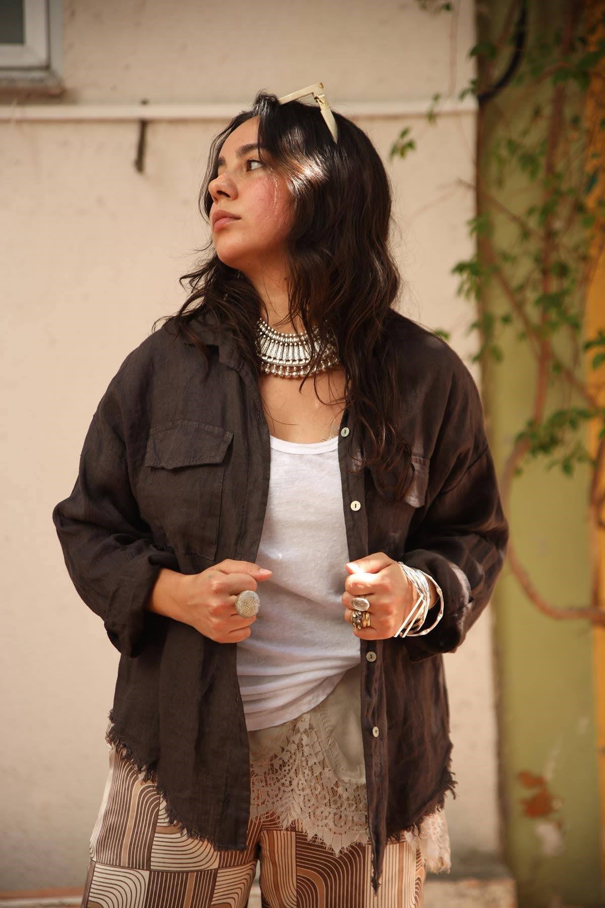 Kahverengi Cepleri Kapaklı Püsküllü Keten Gömlek