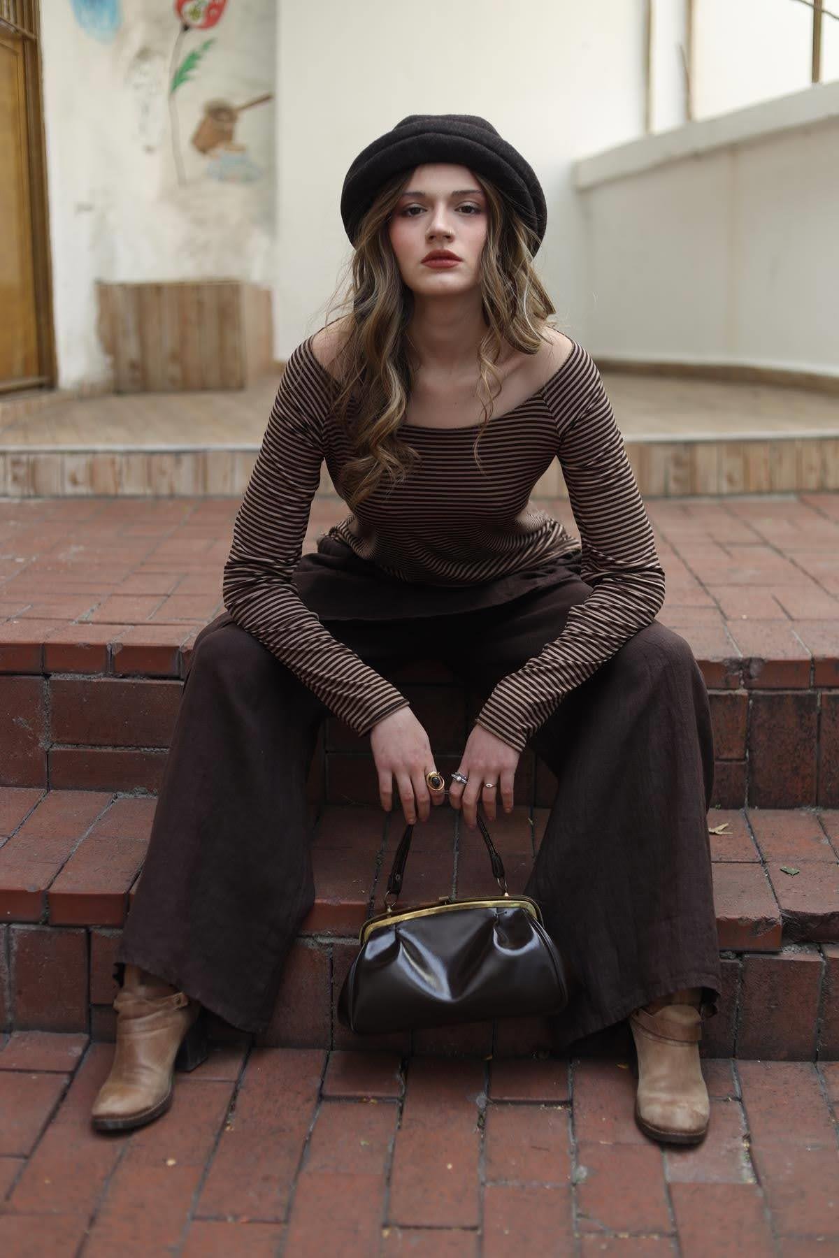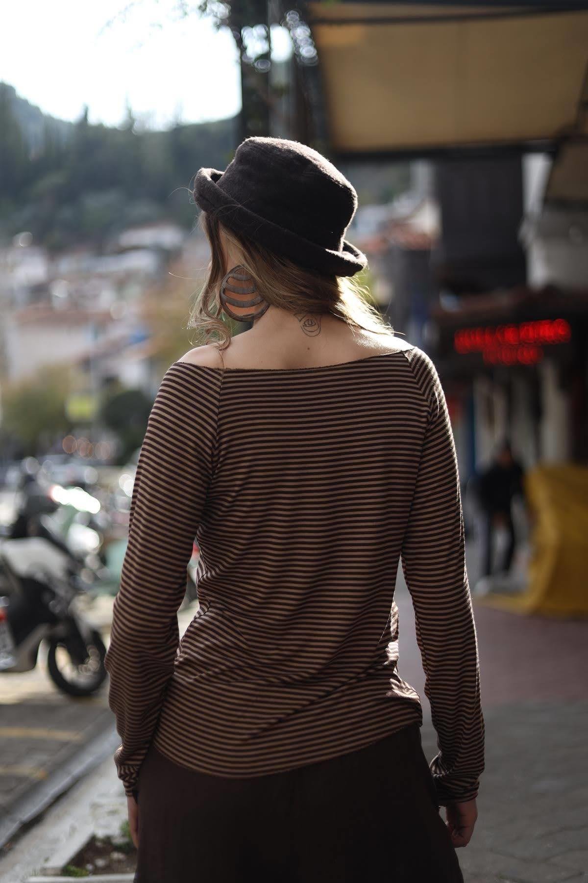 Kahverengi Çizgili Kayık Yaka Bluz (KB-SIT-018-VI-KA-STD)