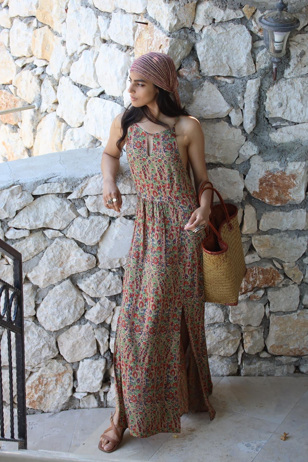Kahverengi Desenli Boyundan Bağlamalı Elbise