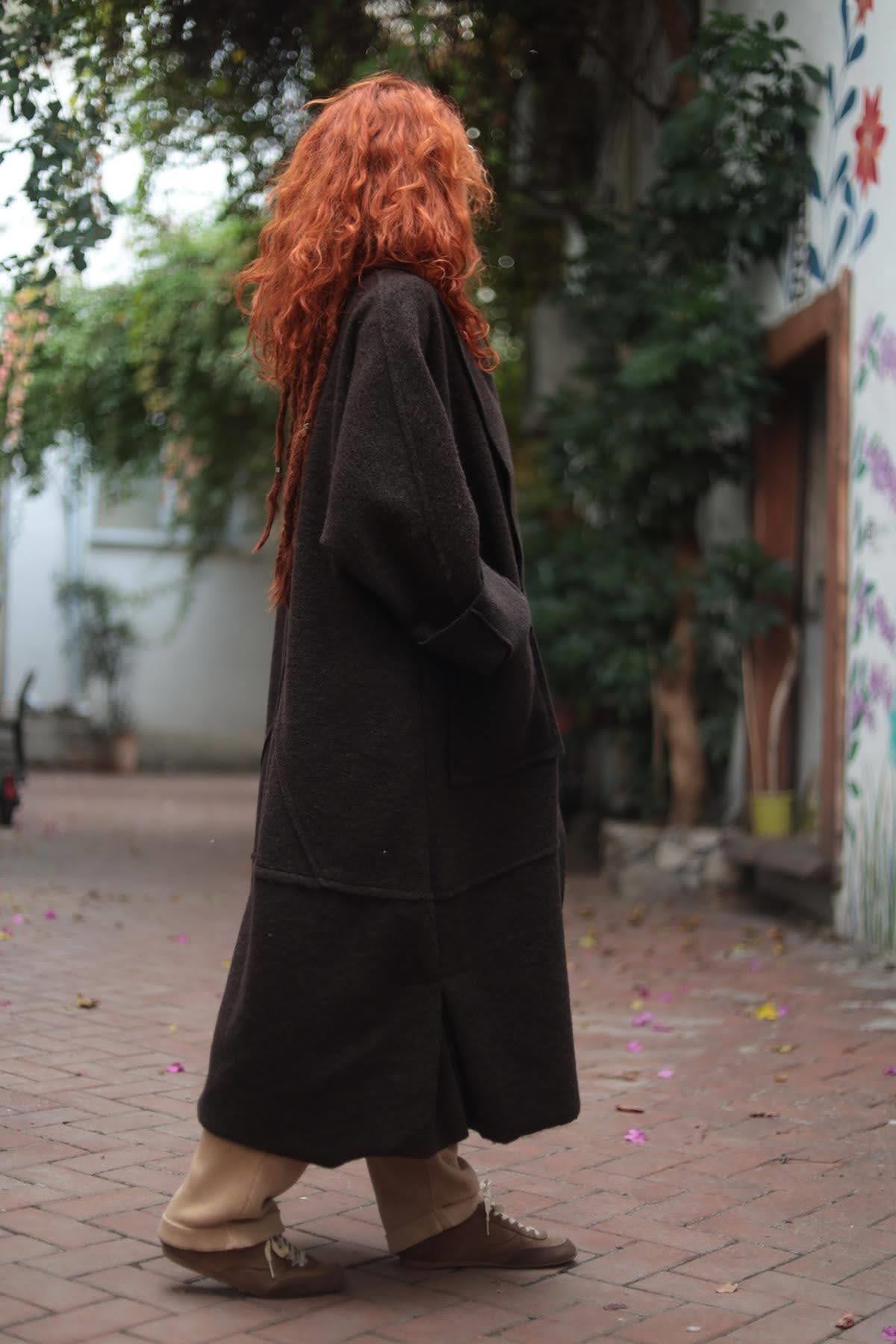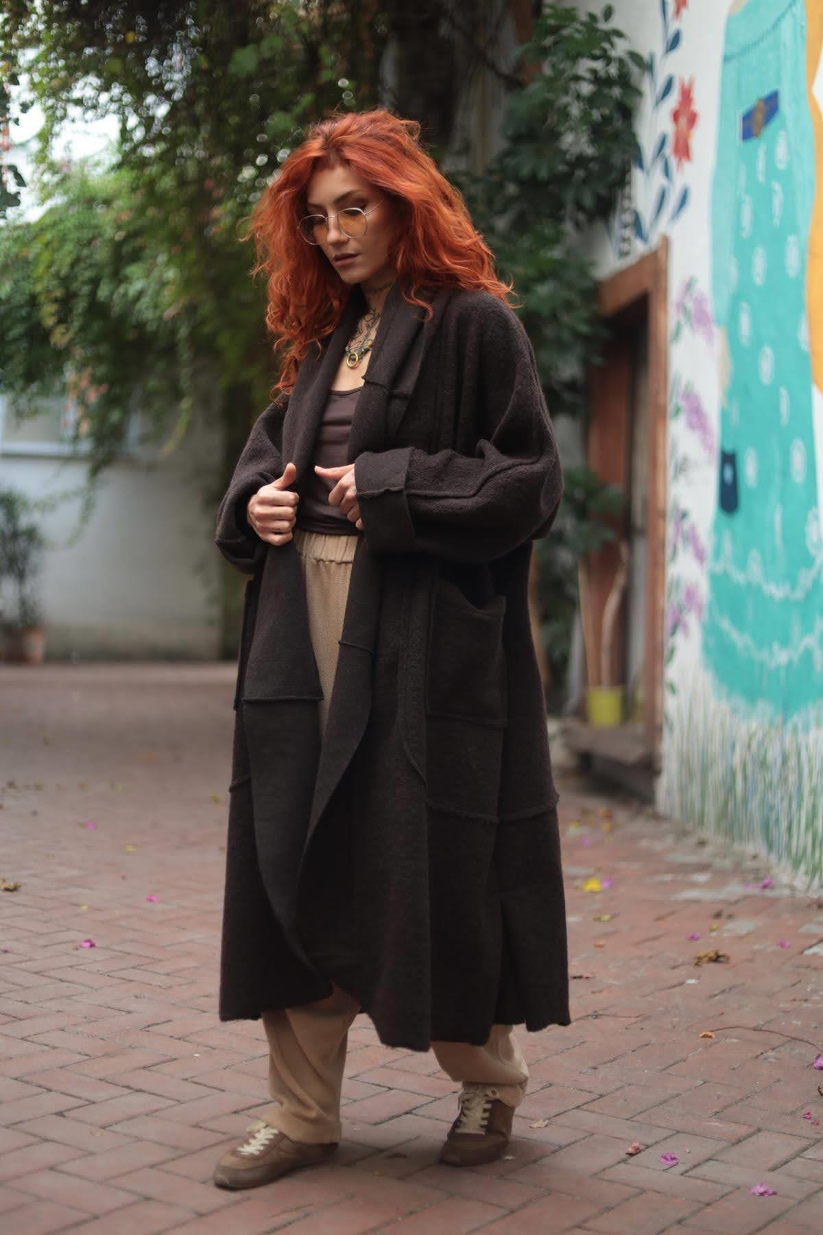 Kahverengi Dikiş Detaylı Şal Yaka Keçe Kaban (KKBN-FAL-005-YUN-KA-STD)