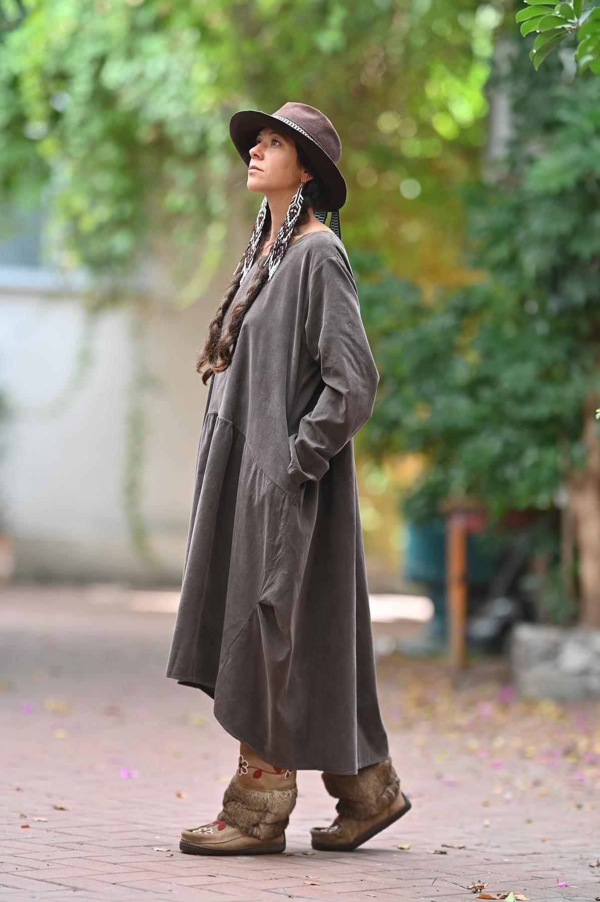 Kahverengi Dikiş Detaylı Yanları Pileli Kadife Elbise (KE-ZA-001-PA-KA-STD)