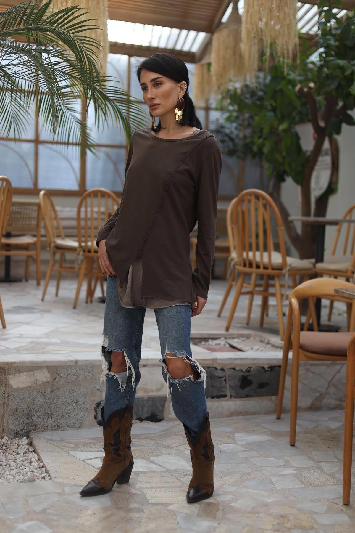 Kahverengi Dikiş Detaylı Yırtmaçlı Penye Bluz (KB-SIT-005-PA-KA-STD)