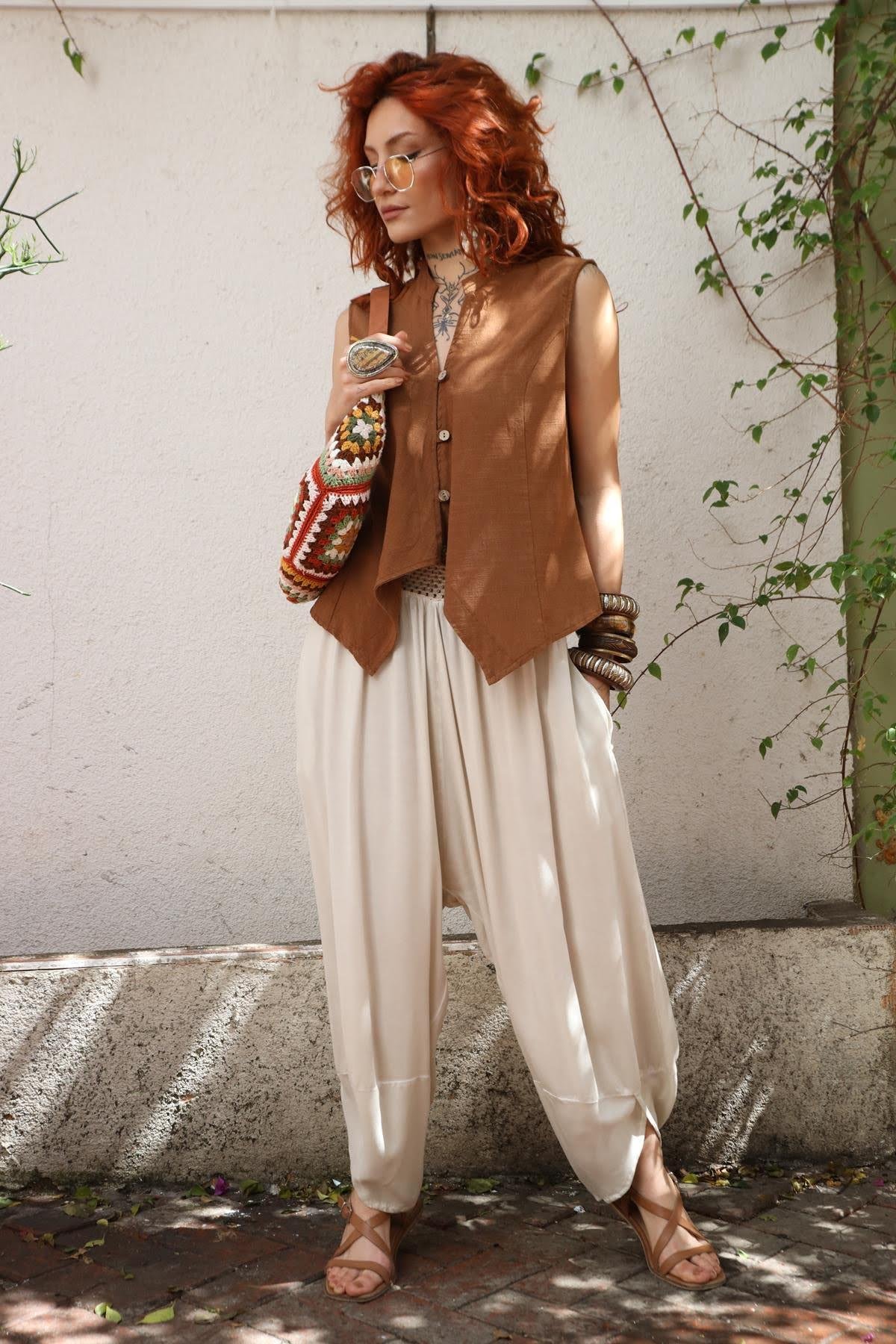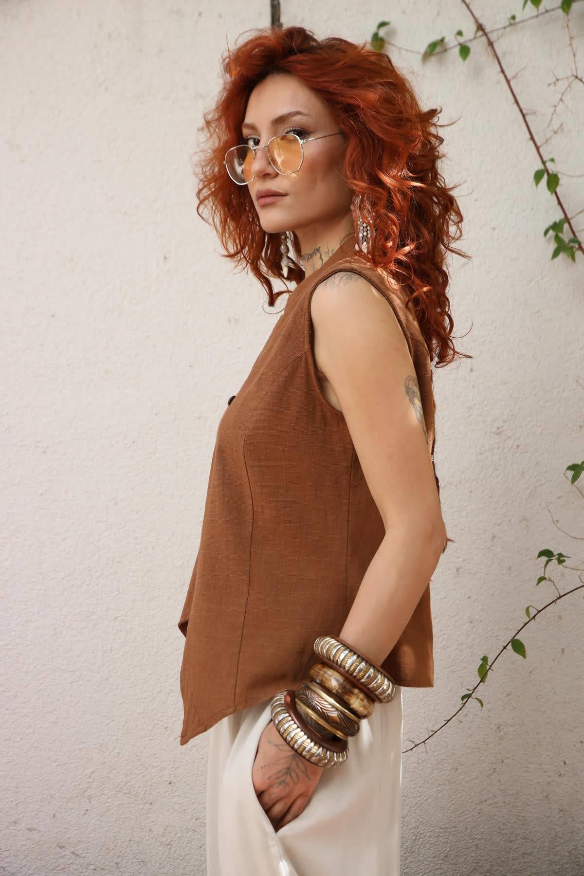 Kahverengi Dikişli Keten Yelek (KY-TRO-003-KTN-KA-S)